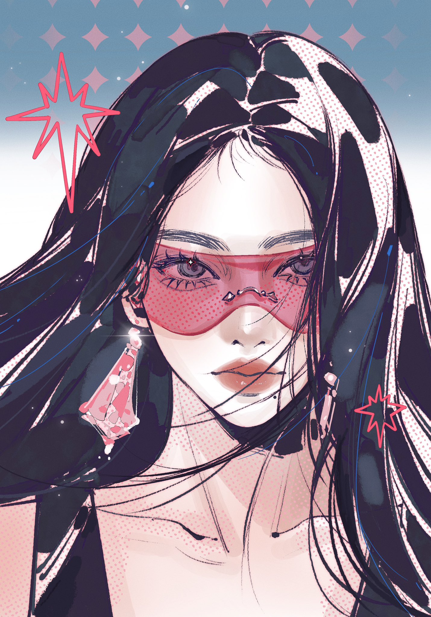 1girl aespa blue_eyes close-up commentary earrings eyelashes floating_hair highres jewelry k-pop karina_(aespa) long_hair looking_at_viewer pink-tinted_eyewear real_life red_lips sparkle untranslatable_commentary tinted_eyewear yuanwei_shaoya