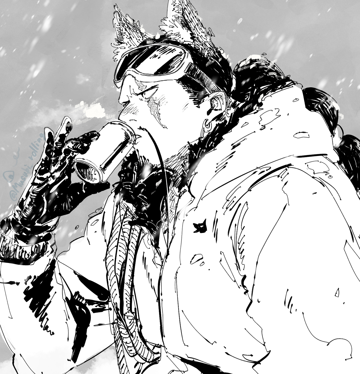 1boy commentary cup facial_hair gloves greyscale highres holding holding_cup hood hooded_coat jabra_(one_piece) looking_ahead male_focus monochrome mustache musubi_rolling one_piece ponytail profile scar scar_on_face smoke ski_goggles snowing solo untranslatable_commentary upper_body