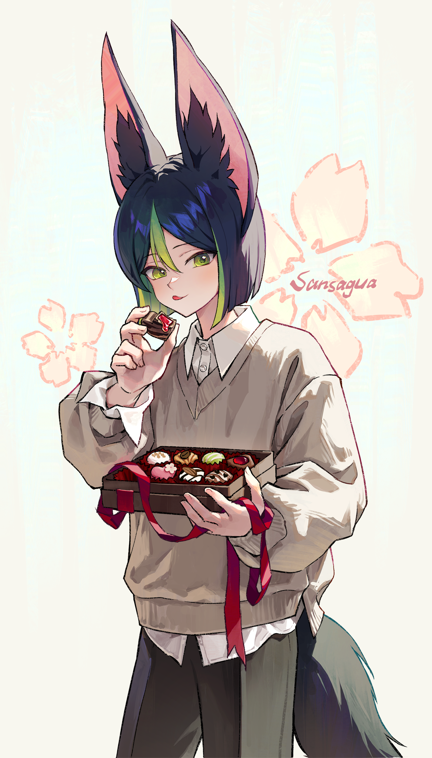 1boy :q absurdres alternate_costume animal_ears artist_name bishounen black_hair black_pants black_tail blunt_ends bob_cut box box_of_chocolates chocolate collared_shirt contemporary cowboy_shot flower_symbol food fox_boy fox_ears genshin_impact gradient_background green_eyes green_hair grey_background grey_sweater hand_up highres holding holding_box holding_chocolate holding_food light_smile long_sleeves looking_at_viewer male_focus open_box pants sansaguaart shirt solo standing sweater tail tighnari_(genshin_impact) tongue tongue_out untucked_shirt v-neck valentine wing_collar