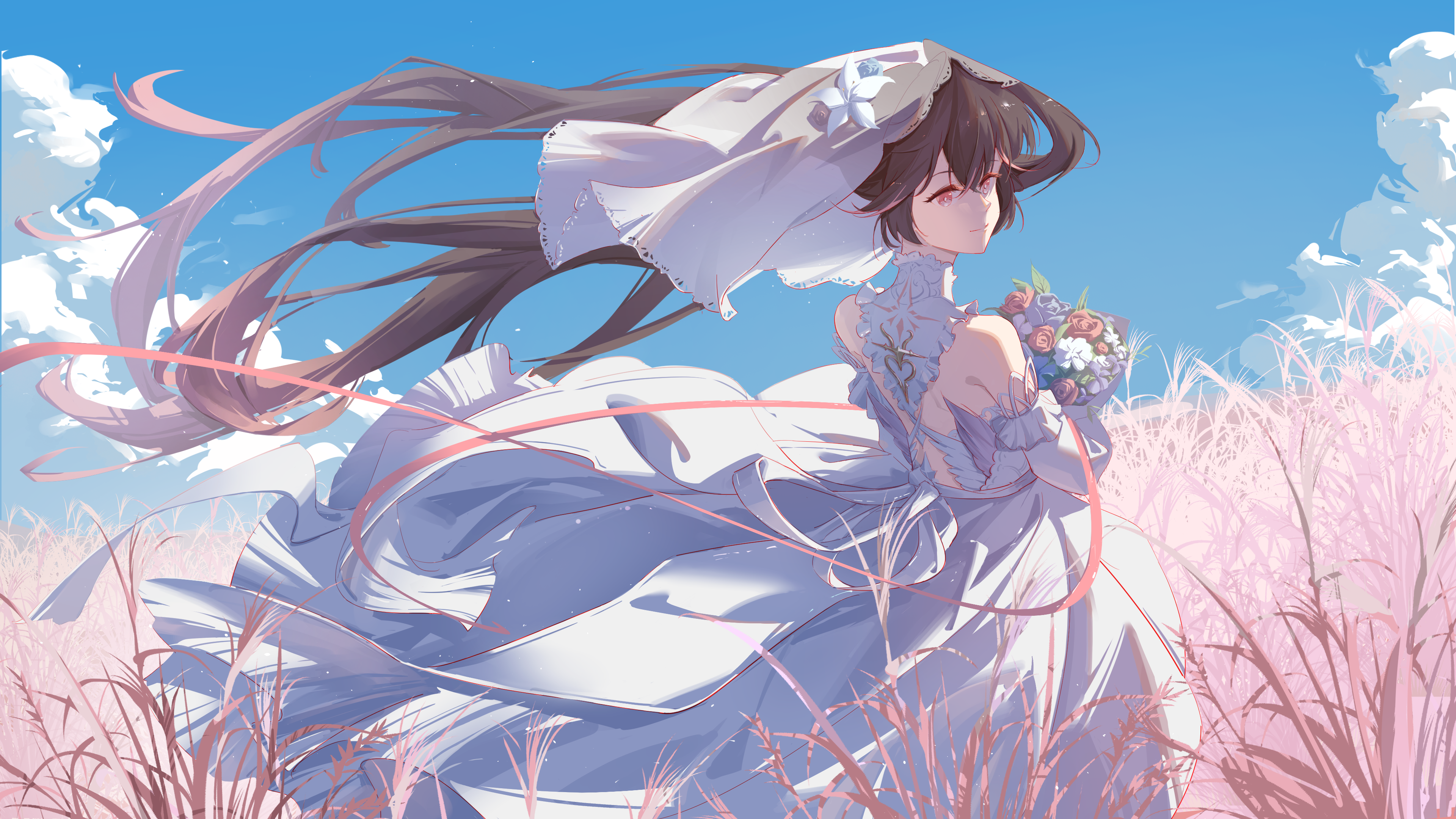 1girl absurdres alternate_costume blue_sky bouquet bridal_veil cloud dress flower hair_between_eyes highres holding holding_bouquet long_hair looking_at_viewer looking_back lucia:_pyroath_(love's_dawn)_(pgr) lucia:_pyroath_(pgr) lucia_(pgr) multicolored_hair official_alternate_costume outdoors pink_ribbon pink_streaks punishing:_gray_raven ribbon sky smile streaked_hair veil very_long_hair wedding_dress white_dress yume_3327