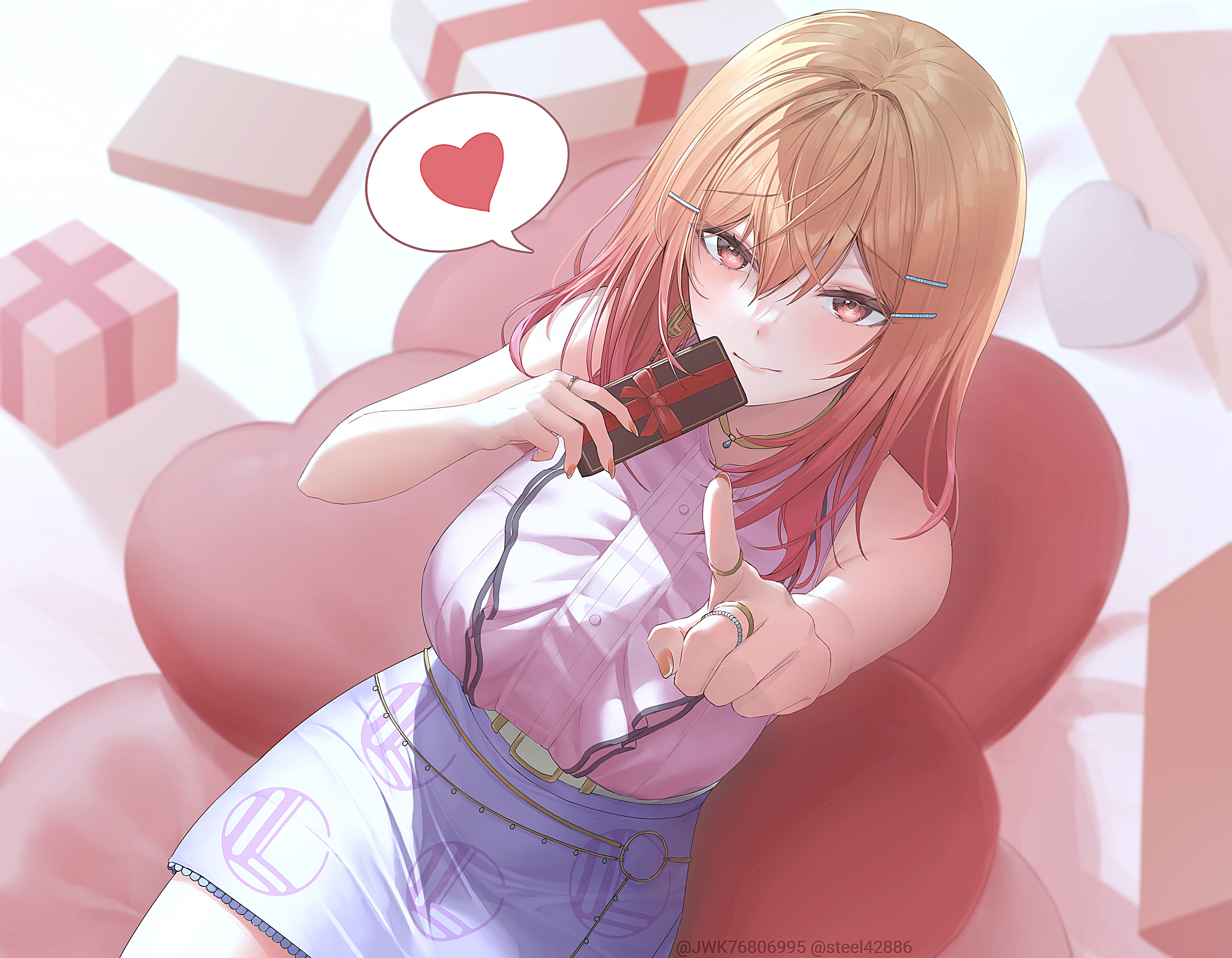 1girl absurdres bare_shoulders belt blue_skirt blush box breasts center_frills closed_mouth commentary earrings fingernails frilled_shirt frills gift gift_box gradient_hair hair_ornament hairclip heart highres holding holding_box holding_gift hololive hololive_dev_is ichijou_ririka ichijou_ririka_(1st_costume) index_finger_raised jewelry large_breasts long_hair looking_ahead multicolored_hair nail_polish necklace orange_hair orange_nails pink_eyes pink_hair pink_shirt pink_skirt pointing ring shirt skirt sleeveless sleeveless_shirt solo spoken_heart steelball_(jwk76806995) thighs two-tone_hair virtual_youtuber white_skirt yellow_belt