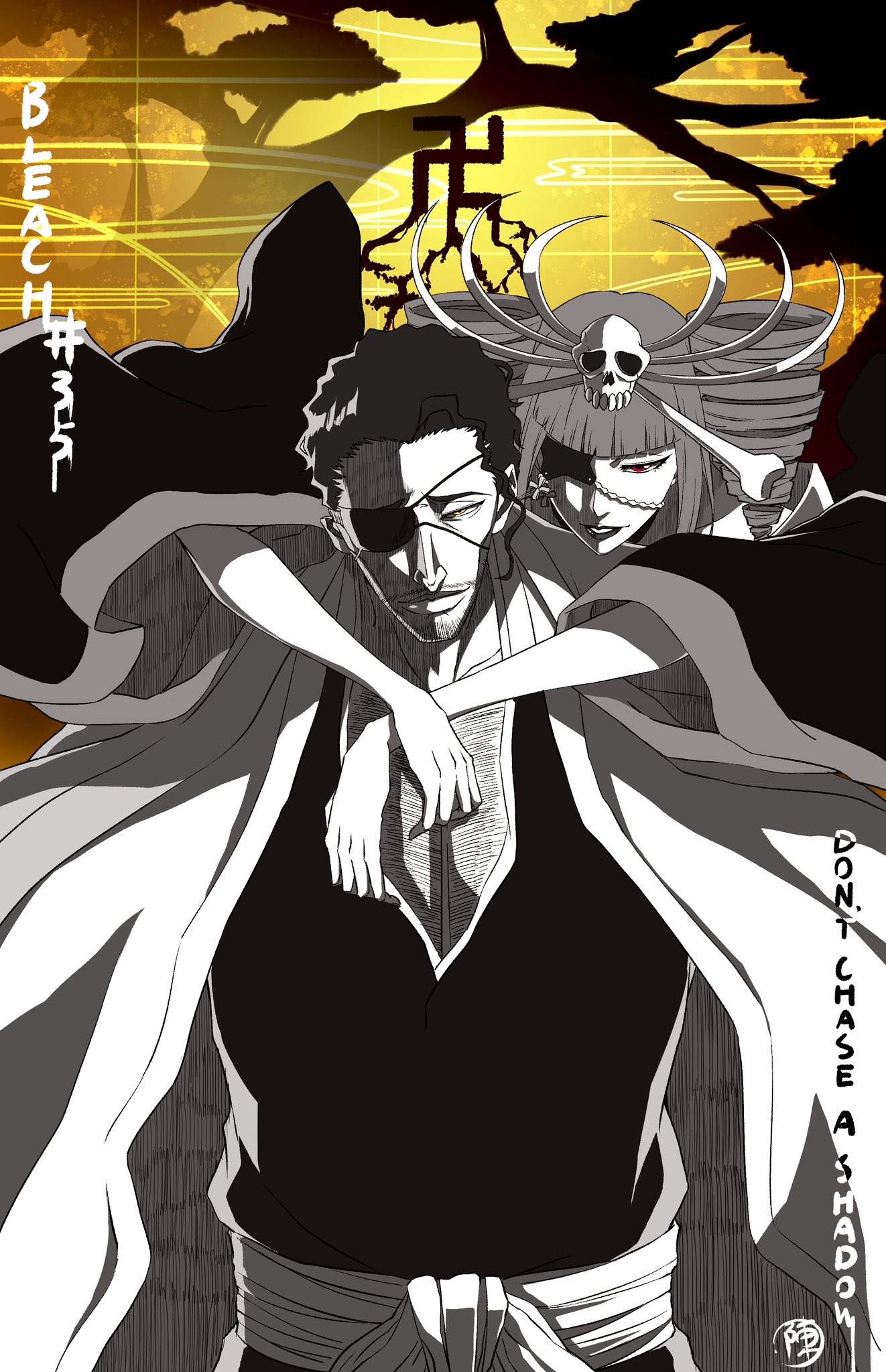 1boy 1girl 7l6cup9yzr1xu7d bankai black_kimono bleach bleach:_sennen_kessen-hen blunt_bangs bone_hair_ornament breasts brown_eyes chest_hair closed_mouth commentary_request copyright_name cowboy_shot drill_hair english_text eyepatch facial_hair floating_clothes forehead hair_ornament haori highres hug hug_from_behind japanese_clothes katen_kyoukotsu katen_kyoukotsu:_karamatsu_shinjuu kimono kyouraku_shunsui lips long_sleeves looking_at_viewer male_focus mature_male medium_breasts nose official_style one_eye_covered parted_lips red_eyes signature skull_and_crossbones skull_hair_ornament smile stubble swastika taichou_haori tsurime twin_drills wide_sleeves