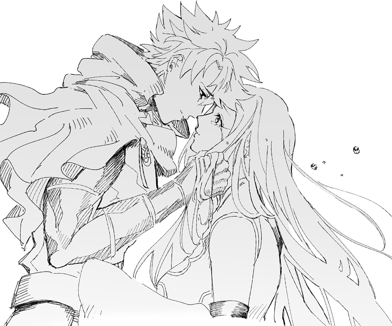 1boy 1girl armor bad_id bad_pixiv_id breastplate breasts capelet crying dress_of_heaven emiya_kiritsugu emiya_kiritsugu_(assassin) eye_contact fate/grand_order fate_(series) greyscale hetero irisviel_von_einzbern irisviel_von_einzbern_(caster) kouya_(kyk428) large_breasts long_hair looking_at_another monochrome streaming_tears tears wide_sleeves