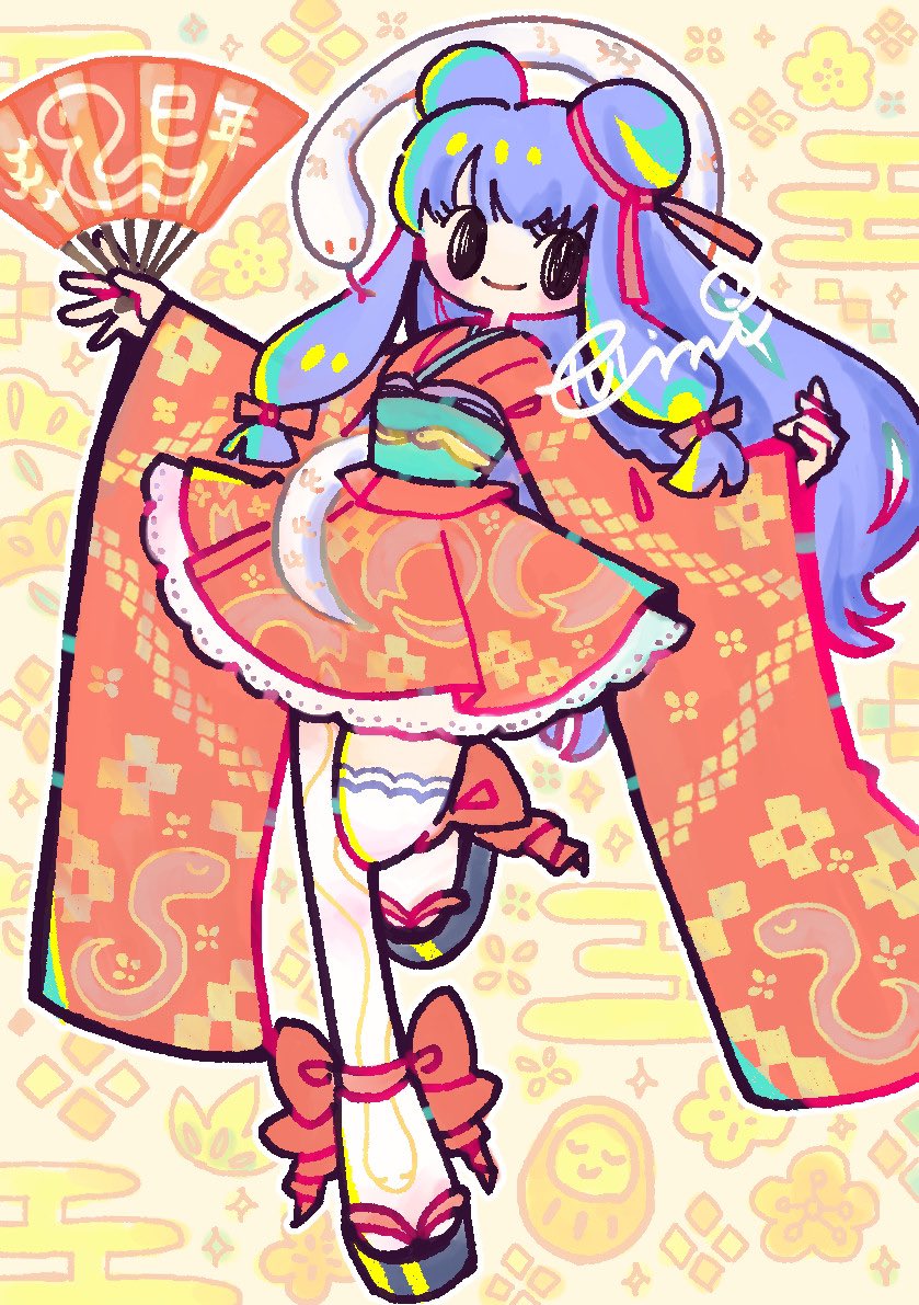 1girl black_eyes chinese_zodiac fuziemi hand_fan long_hair purple_hair ranma_1/2 shampoo_(ranma_1/2) sidelocks smile snake snake_print thighhighs white_thighhighs wide_sleeves year_of_the_snake