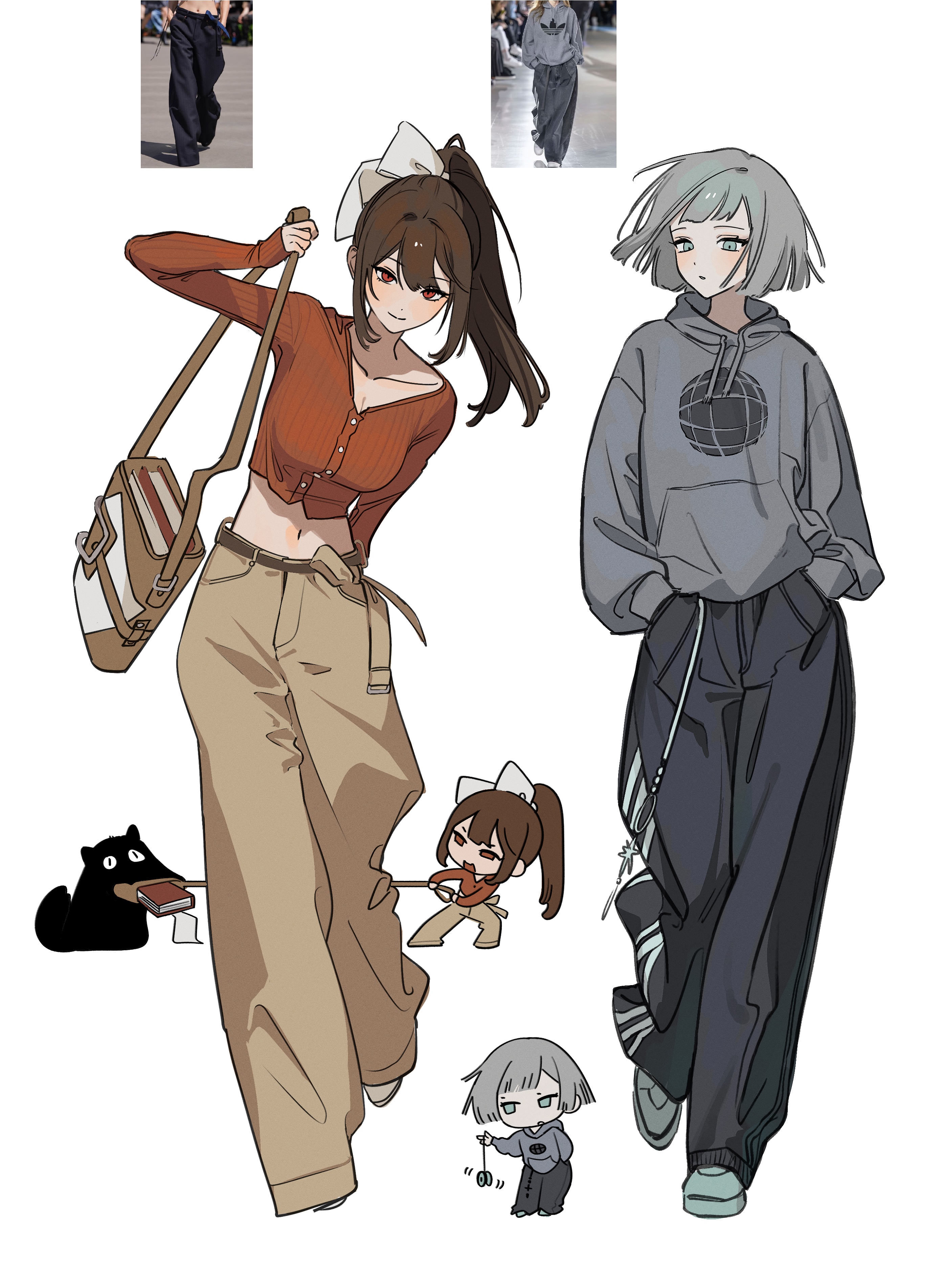 2girls absurdres aqua_eyes aqua_shoes bag black_pants breasts brown_hair brown_pants cardigan chibi chibi_inset cleavage commentary cropped_cardigan full_body grey_hair grey_hoodie hands_in_pockets high_ponytail highres holding holding_bag hood hood_down hoodie loose_pants mercuria_(reverse:1999) midriff multiple_girls pants photo-referenced ponytail red_cardigan red_eyes reference_inset reverse:1999 semmelweis_(reverse:1999) shoes sweatpants szztzzs v-neck yo-yo