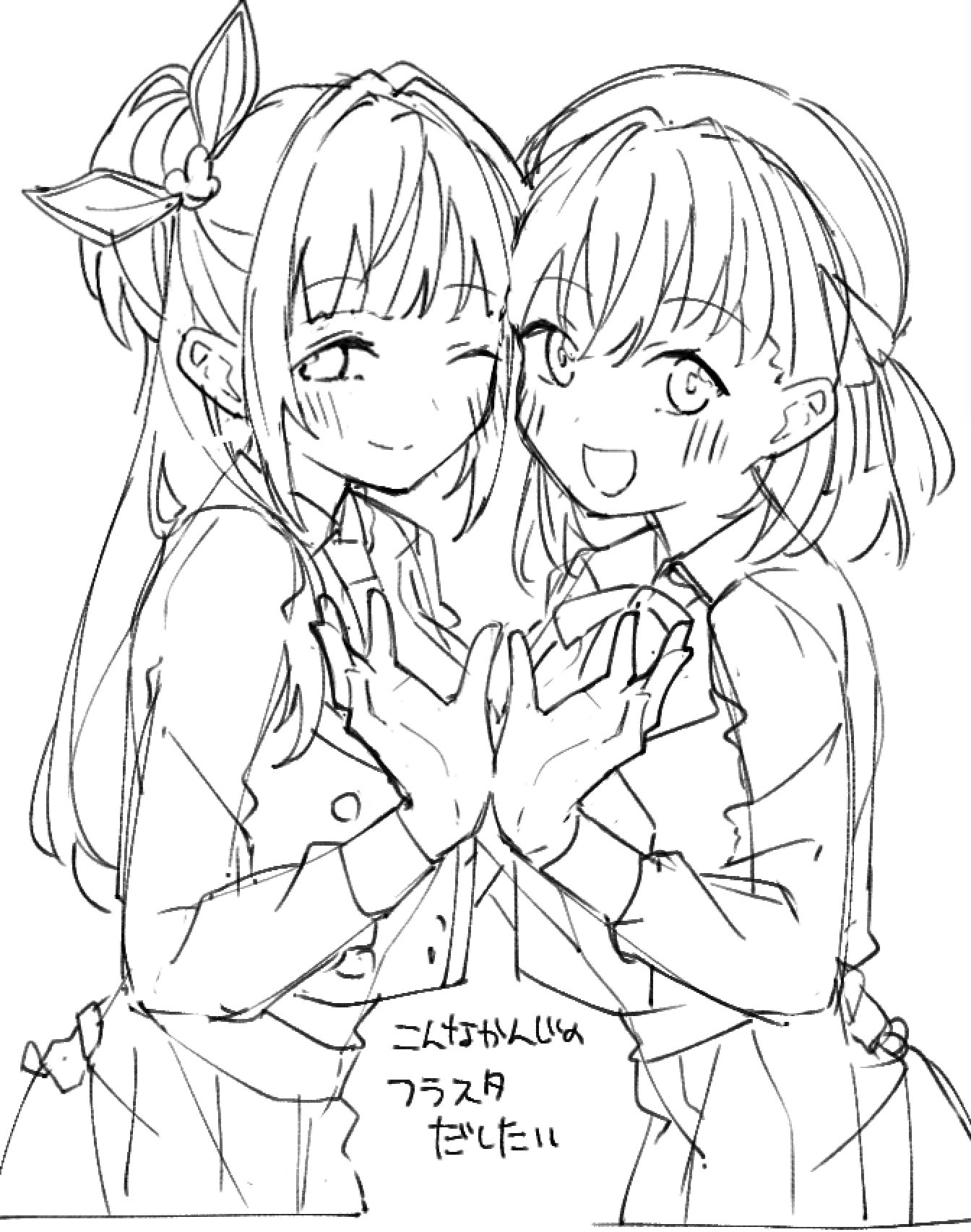 2girls :d ;) beret blush buttons cerise_bouquet clothes_lift collared_shirt cropped_jacket crossed_bangs double-breasted dress_shirt flower fortune_movie_(love_live!) greyscale hair_bun hair_flower hair_intakes hair_ornament hair_ribbon hat highres hinoshita_kaho link!_like!_love_live! liz_(piyoko_piyop) long_hair long_sleeves looking_at_viewer love_live! medium_hair monochrome multiple_girls official_alternate_costume one_eye_closed open_mouth otomune_kozue pleated_skirt ribbon shirt side_ponytail sidelocks simple_background single_side_bun sketch skirt smile split_mouth translation_request two_side_up virtual_youtuber white_background