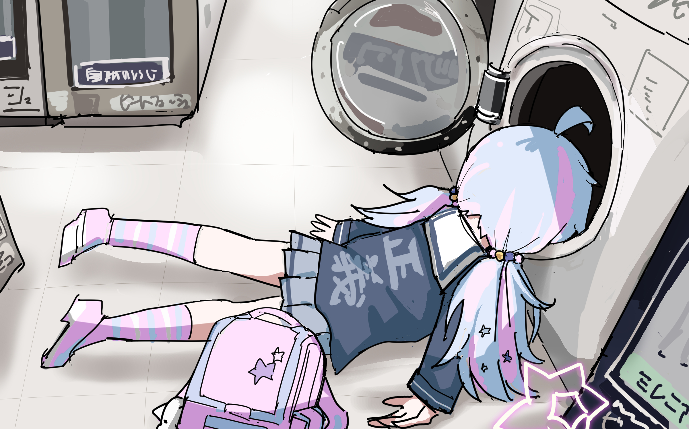 1girl blue_archive from_above from_behind grey_serafuku grey_skirt hair_ornament halo highres low_twintails lying multicolored_hair pink_bag pink_halo pink_socks reisa_(blue_archive) sailor_collar school_uniform serafuku skirt socks star_(symbol) star_hair_ornament star_halo striped_clothes striped_socks tenten_(chan4545) twintails washing_machine white_sailor_collar