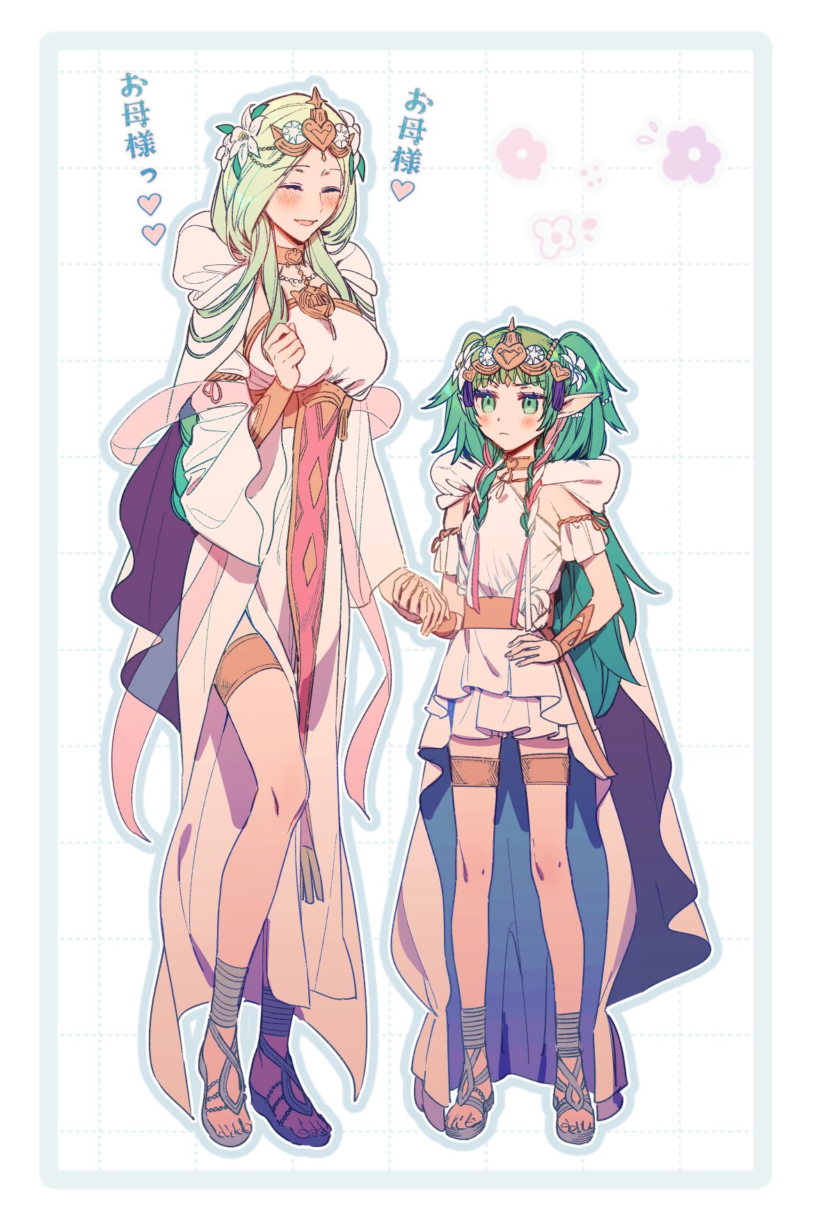 2girls ^_^ blush breasts closed_eyes commentary_request dress female_focus fire_emblem fire_emblem:_three_houses fire_emblem_heroes full_body gladiator_sandals green_eyes green_hair hand_on_own_hip highres holding_hands inset_border iwasinogomaae long_hair matching_hair/eyes medium_breasts mother_and_child mother_and_daughter multiple_girls nintendo official_alternate_costume open_mouth parent_and_child rhea_(aura_of_love)_(fire_emblem) rhea_(fire_emblem) sandals smile sothis_(aura_of_love)_(fire_emblem) sothis_(fire_emblem) tiara translation_request white_dress