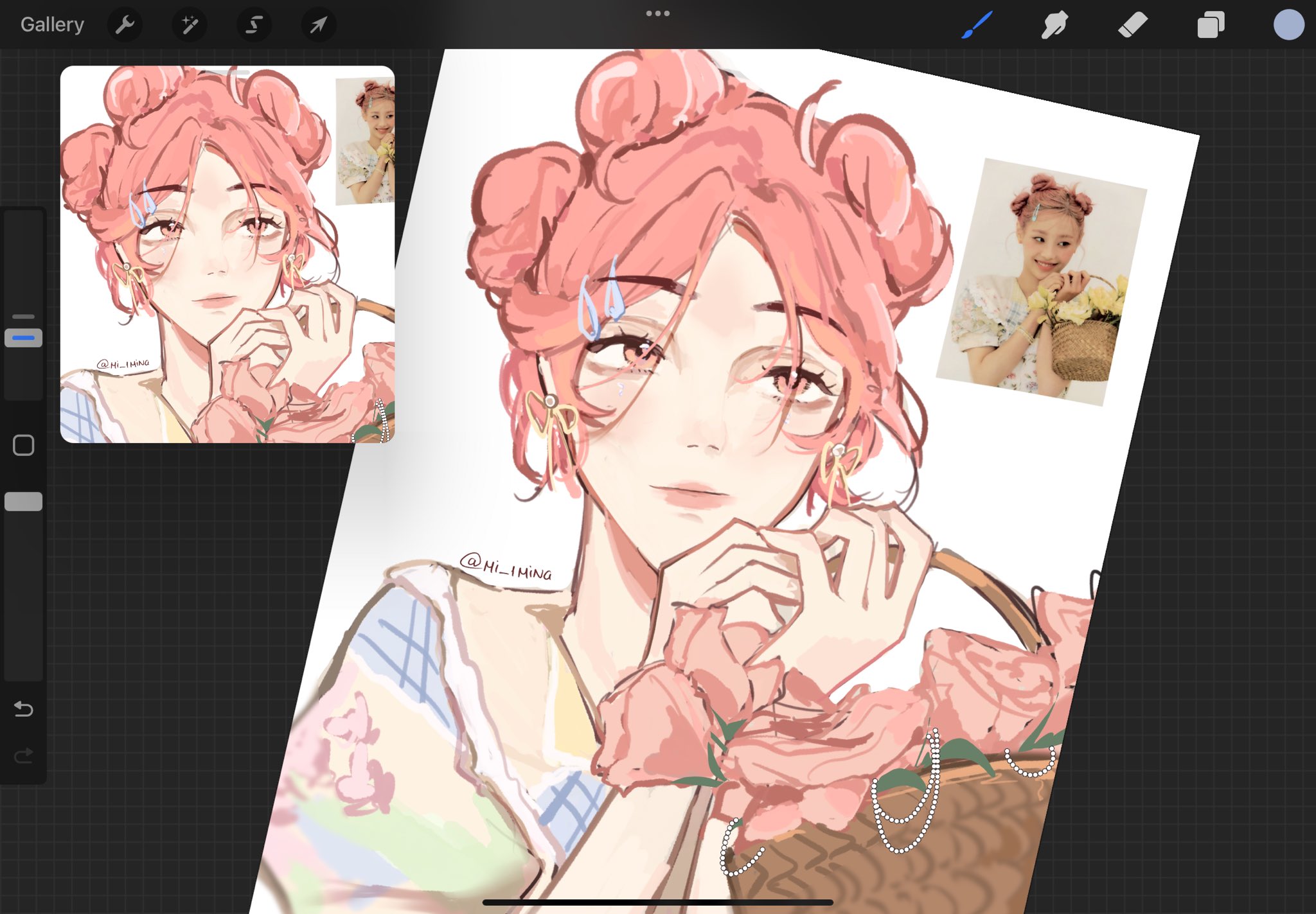 2girls art_program_in_frame basket chuu_(loona) closed_mouth commentary east_asian english_commentary flower flower_basket hair_ornament hairclip hands_up highres holding holding_basket kininatteru_hito_ga_otoko_ja_nakatta mitsuayacanon multiple_girls multiple_hair_buns multiple_views oosawa_aya parted_bangs photo_inset pink_eyes pink_flower pink_hair procreate_(software) puffy_short_sleeves puffy_sleeves real_life reference_inset short_sleeves twitter_username white_background