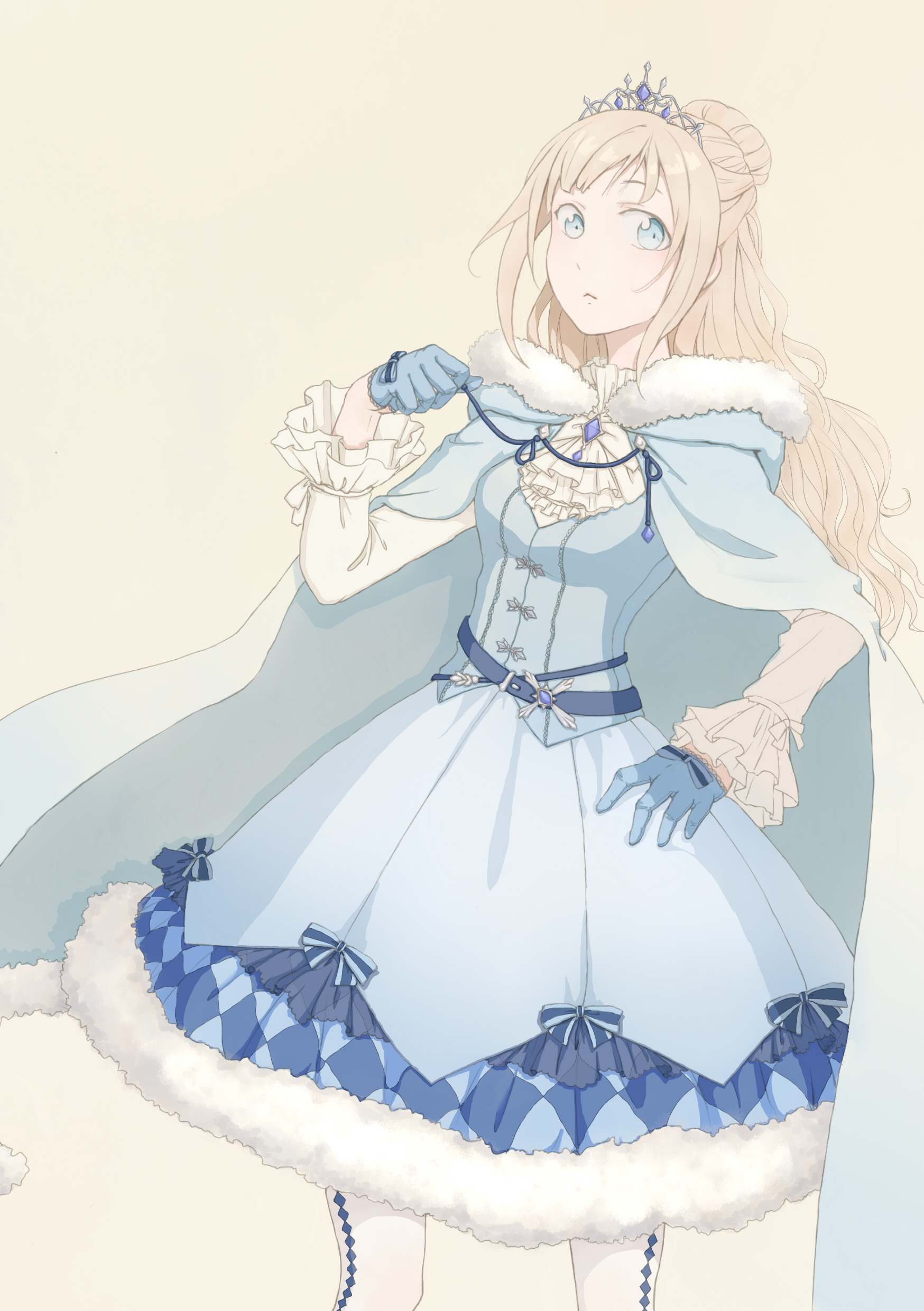 1girl absurdres adjusting_neck_ribbon argyle_clothes argyle_dress argyle_pantyhose ascot belt belt_buckle blonde_hair blue_belt blue_cloak blue_dress blue_eyes blue_gloves blue_ribbon buckle cloak closed_mouth cowboy_shot dress dress_shirt expressionless frilled_sleeves frills fur-trimmed_cloak fur-trimmed_dress fur-trimmed_hood fur_trim gloves grey_tiara hair_bun hand_on_own_hip highres hood hood_down hooded_cloak light_frown long_hair long_sleeves looking_at_viewer medium_dress military_princess_(miracle_nikki) miracle_nikki neck_ribbon nikki_(series) pantyhose pinafore_dress princess ribbon shirt short_dress simple_background single_hair_bun sleeveless sleeveless_dress solo standing tiara very_long_hair white_ascot white_pantyhose white_shirt yellow_background ylllkong