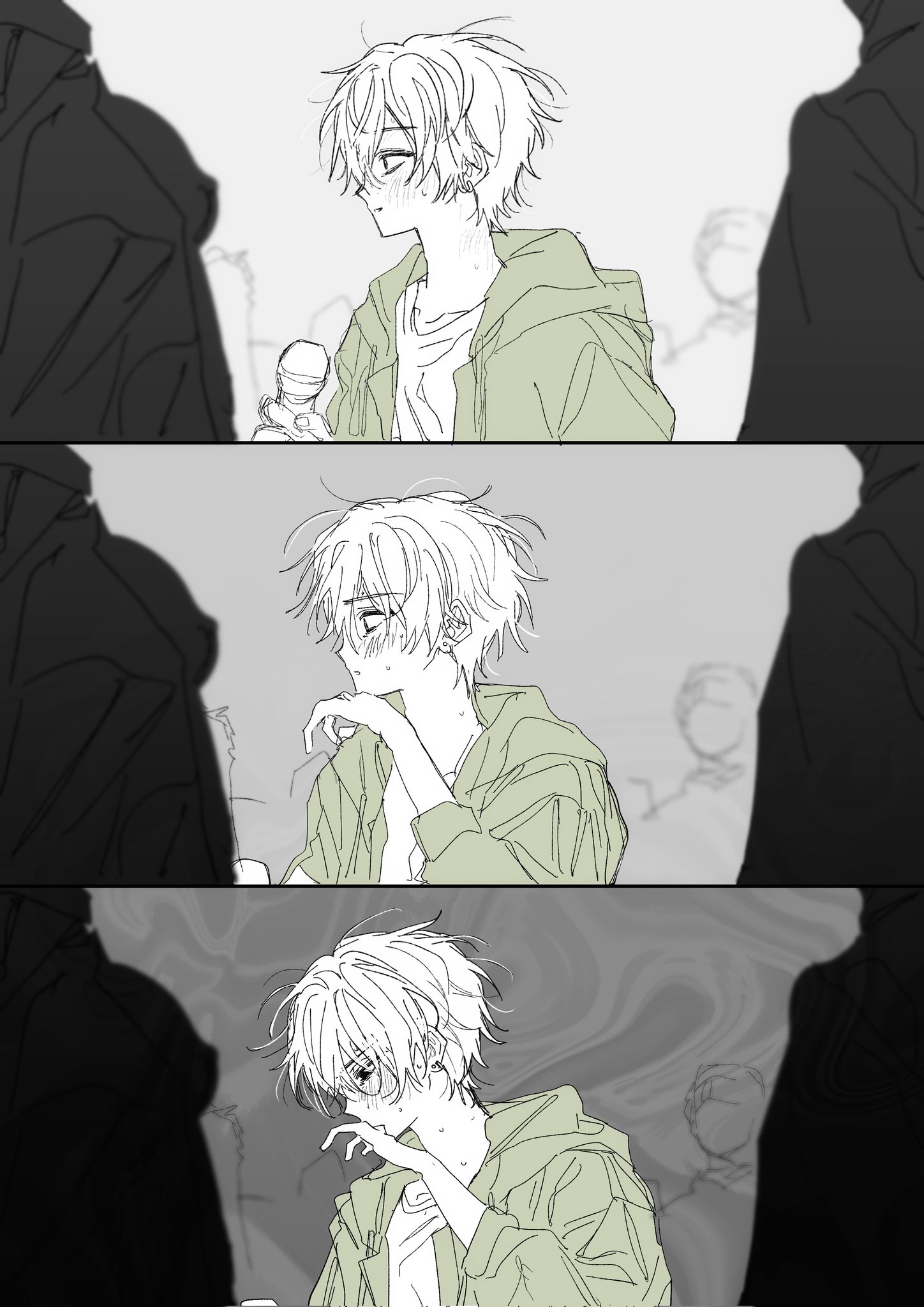 akita_toushirou from_side goguma_wagamja green_hoodie highres holding holding_microphone hood hoodie limited_palette looking_down male_focus microphone project_sekai shirt short_hair solo_focus sweat upper_body very_short_hair