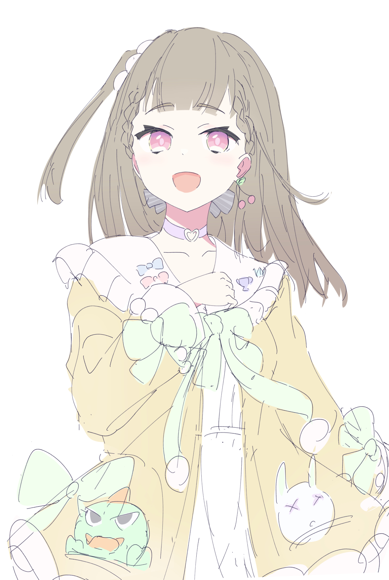 1girl :d alternate_color black_bow bow braid brown_hair center-flap_bangs cherry_earrings choker collarbone commentary cosplay cowboy_shot dress earrings food-themed_earrings food_themed_earrings frilled_sailor_collar frills gonzales_(love_live!) hair_bow hakuchu_a_la_mode heart heart_o-ring heart_ring_choker highres jewelry junnatsu kachimachi_kosuzu link!_like!_love_live! long_hair long_sleeves looking_at_viewer love_live! o-ring o-ring_choker one_side_up open_mouth osawa_rurino osawa_rurino_(cosplay) pink_eyes sailor_collar side_ahoge side_braids simple_background single_earring smile solo straight_hair stuffed_dinosaur virtual_youtuber white_background white_sailor_collar yellow_dress