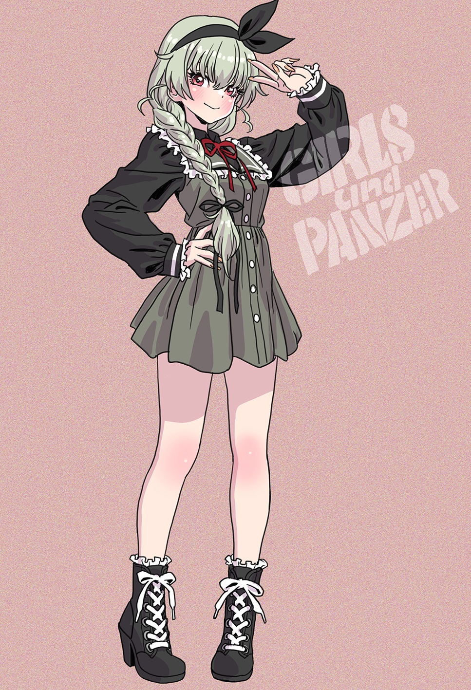 1girl alternate_costume alternate_hairstyle anchovy_(girls_und_panzer) black_boots black_ribbon black_sleeves blush boots braid copyright_name dress frilled_sleeves frills girls_und_panzer green_dress green_hair hair_ribbon hand_on_own_hip high_heel_boots high_heels highres long_hair long_sleeves pink_background red_eyes red_ribbon ribbon short_dress single_braid smile v yamashita_shun'ya