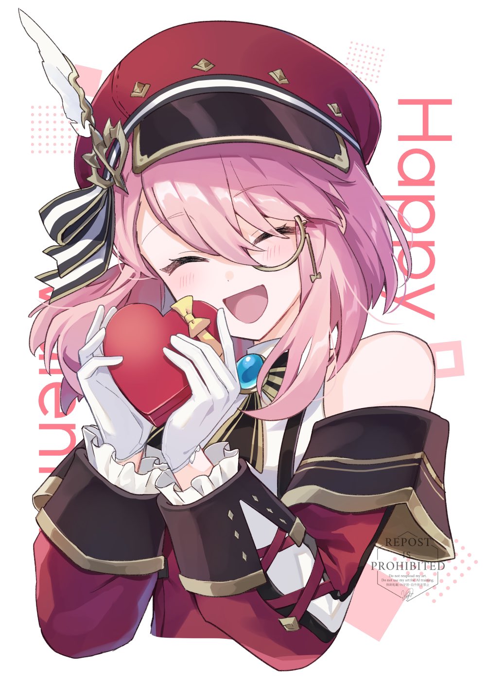 1girl bare_shoulders blue_gem bow bowtie box newsboy_cap charlotte_(genshin_impact) closed_eyes commentary_request detached_sleeves english_text facing_viewer floating_hair gem genshin_impact gloves hands_up happy_valentine hat hat_feather heart-shaped_box highres holding holding_box long_sleeves medium_hair open_mouth pink_hair red_hat shirase_(shirose) simple_background smile solo upper_body white_background white_gloves