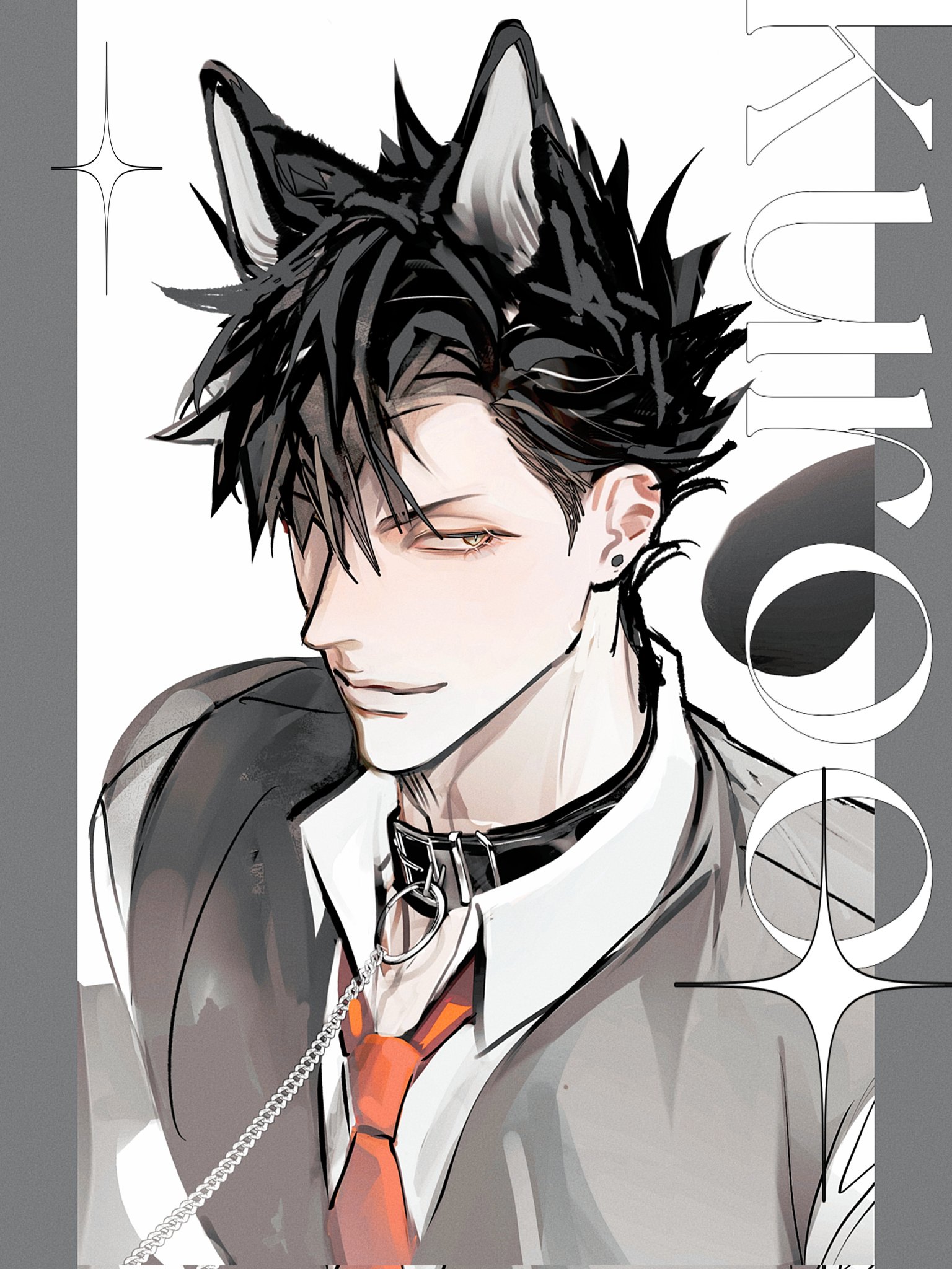 1boy animal_ears belt belt_collar black_belt black_hair cat_boy cat_ears character_name closed_mouth collar collared_shirt commentary earrings grey_vest haikyuu!! hair_over_one_eye highres jewelry kemonomimi_mode kuroo_tetsurou leash looking_to_the_side male_focus necktie one_eye_covered open_collar piercing red_necktie shirt sideways_glance smile solo sparkle spiked_hair stud_earrings vest white_shirt wing_collar yellow_eyes zhouzhou0331