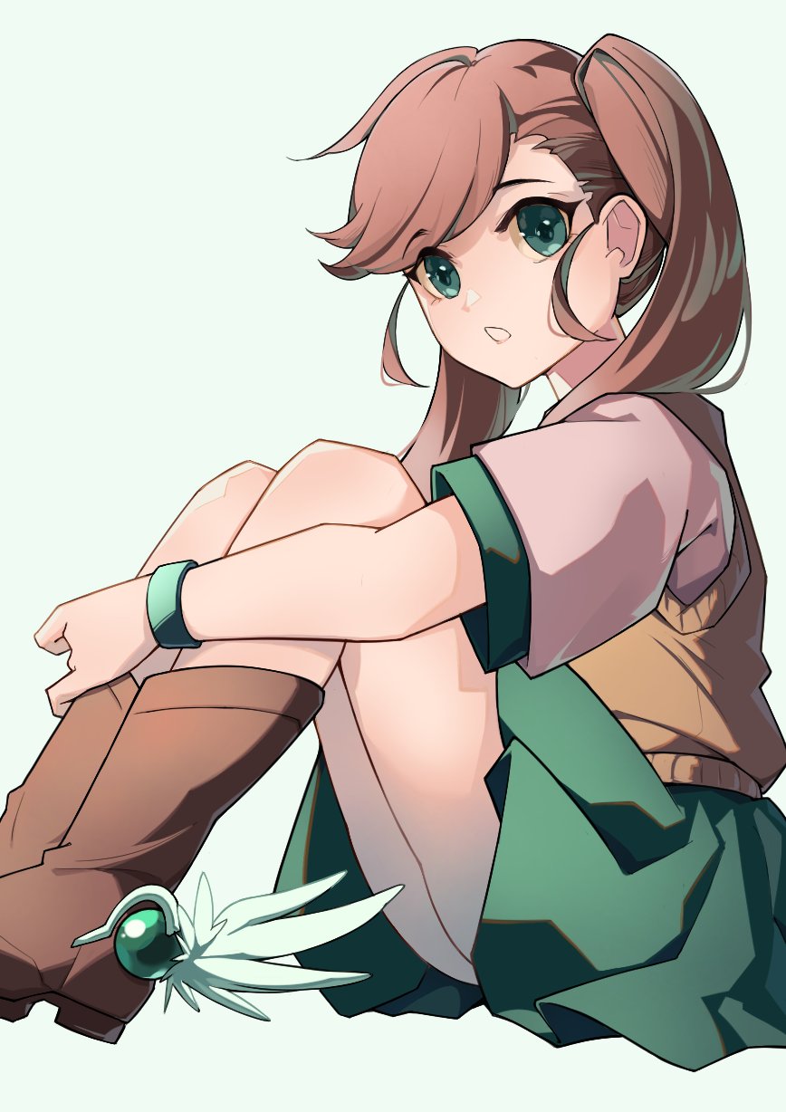 1girl ankle_wings brown_hair green_eyes highres long_hair nanase_(under_night_in-birth) school_uniform skirt solo sweater_vest tierra_misu twintails under_night_in-birth wings
