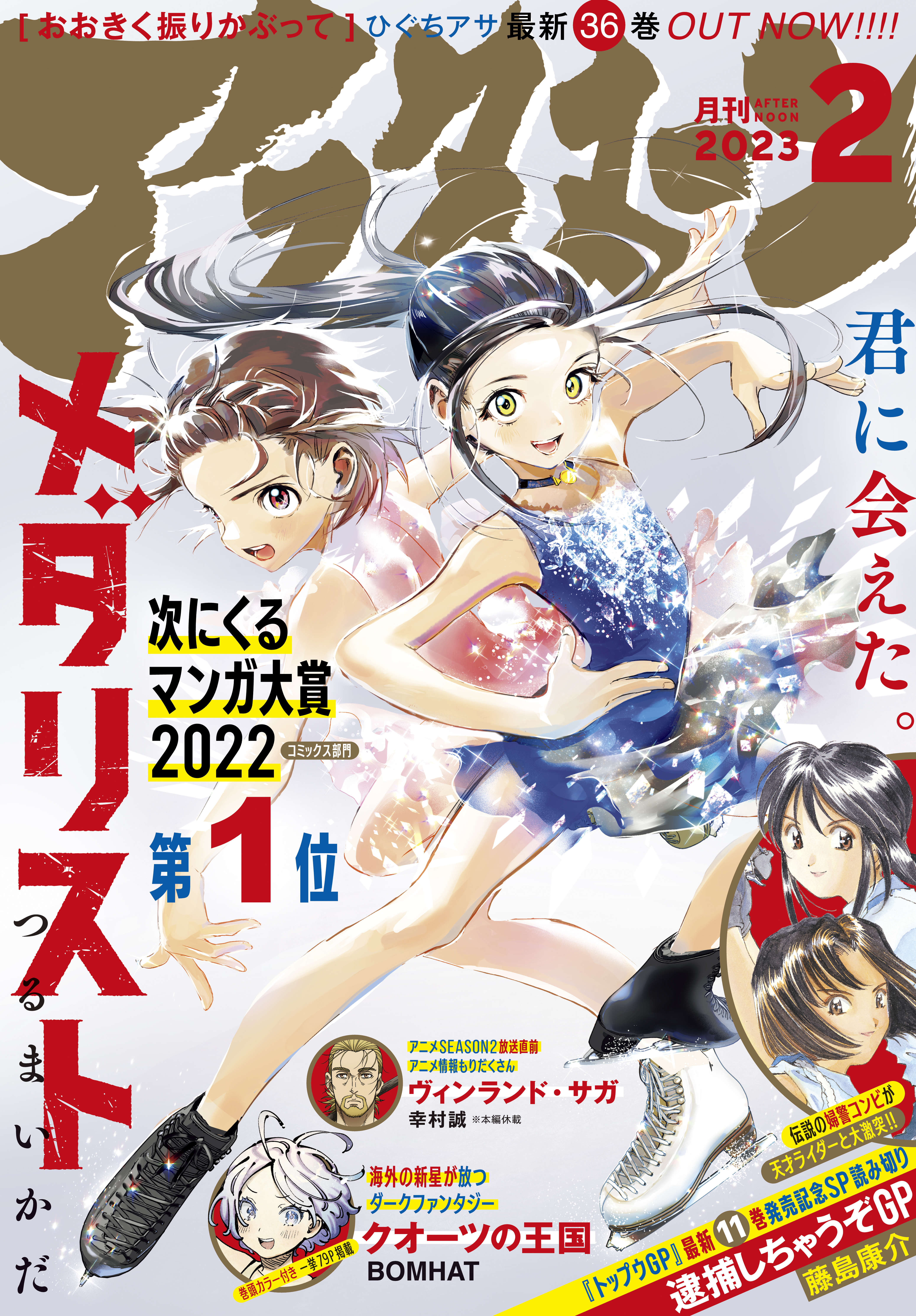 2girls absurdres afternoon_(magazine) black_hair cover highres kamisaki_hikaru long_hair magazine_cover medalist_(manga) multiple_girls short_hair yuitsuka_inori