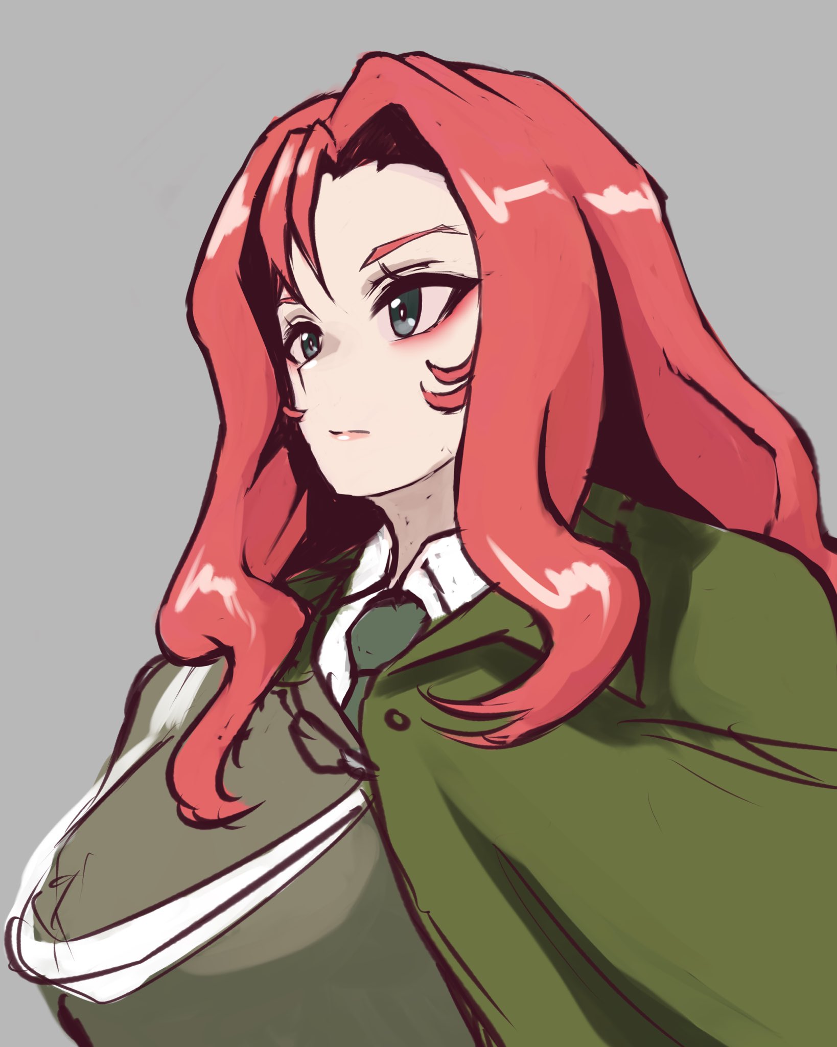 1girl black_eyes bonple_military_uniform bougainvillea_(unnryuu) cape collared_shirt girls_und_panzer green_cape green_necktie grey_background grey_jacket highres jacket long_hair maiko_(girls_und_panzer) necktie red_hair shirt white_shirt