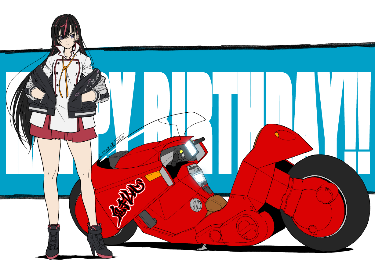 1girl akira_(manga) black_hair black_jacket closed_mouth commentary_request dated full_body grey_eyes hair_between_eyes hands_in_pockets happy_birthday high_heels inago_akira jacket kaneda_shoutarou's_bike long_hair long_sleeves looking_at_viewer minoseki_academy_school_uniform motor_vehicle motorcycle multicolored_hair name_connection neck_ribbon niitsuma_daisuke_(animator) off_shoulder orange_ribbon red_hair red_skirt ribbon shirt skirt solo standing streaked_hair toji_no_miko white_shirt winter_uniform