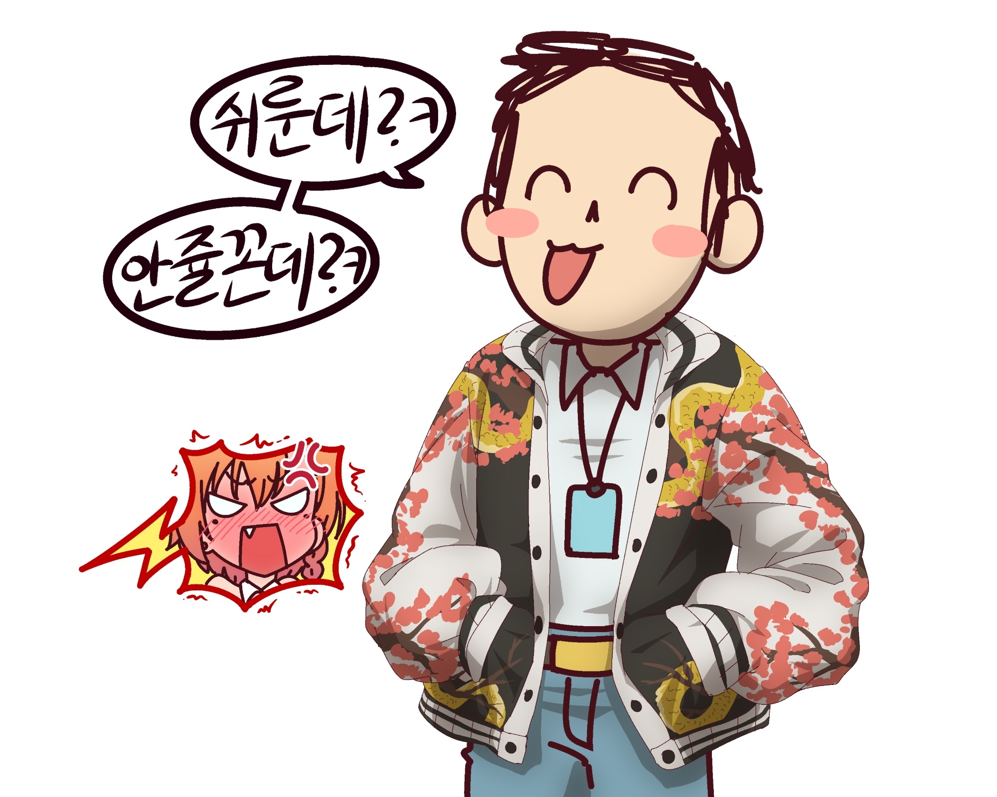 1boy 1girl anger_vein angry blue_archive blush bow bowtie braid doodle_sensei_(blue_archive) fang full-face_blush highres jacket jin_rey korean_text mole mole_under_each_eye mole_under_eye multiple_moles neru_(blue_archive) neru_(bunny)_(blue_archive) print_jacket sensei_(blue_archive) speech_bubble spoken_character sukajan