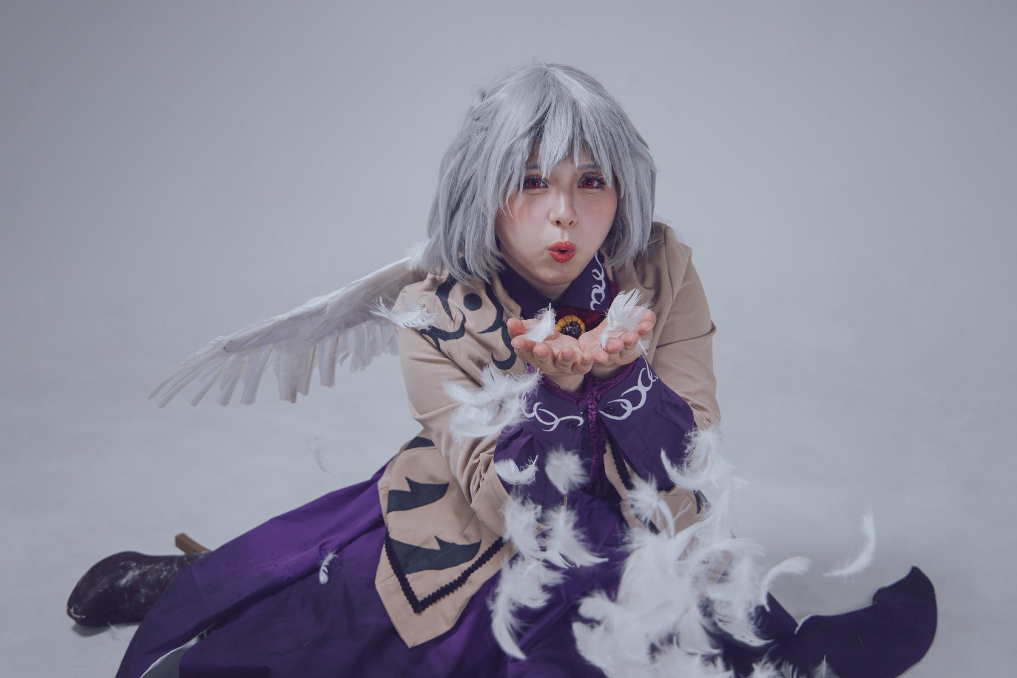 1girl blowing blurry bow bowtie brooch collared_shirt cosplay cosplay_photo depth_of_field east_asian feathered_wings feathers grey_hair high_heels highres jacket jewelry k_o_j_i_5 kishin_sagume lips long_sleeves looking_at_viewer nose open_mouth photo_(medium) real_life red_bow red_bowtie red_eyes shirt shoes short_hair simple_background single_wing sitting skirt touhou white_background white_wings wings