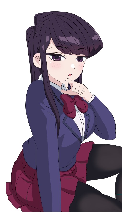 black_eyes black_hair black_pantyhose blue_jacket bow bowtie collared_shirt feet_out_of_frame from_side hand_on_own_face hmangadd itan_private_high_school_uniform jacket komi-san_wa_komyushou_desu komi_shouko long_hair long_sleeves looking_at_viewer miniskirt open_mouth pantyhose pleated_skirt red_bow red_bowtie red_skirt school_uniform shirt sidelocks simple_background sitting skirt white_background white_shirt winter_uniform