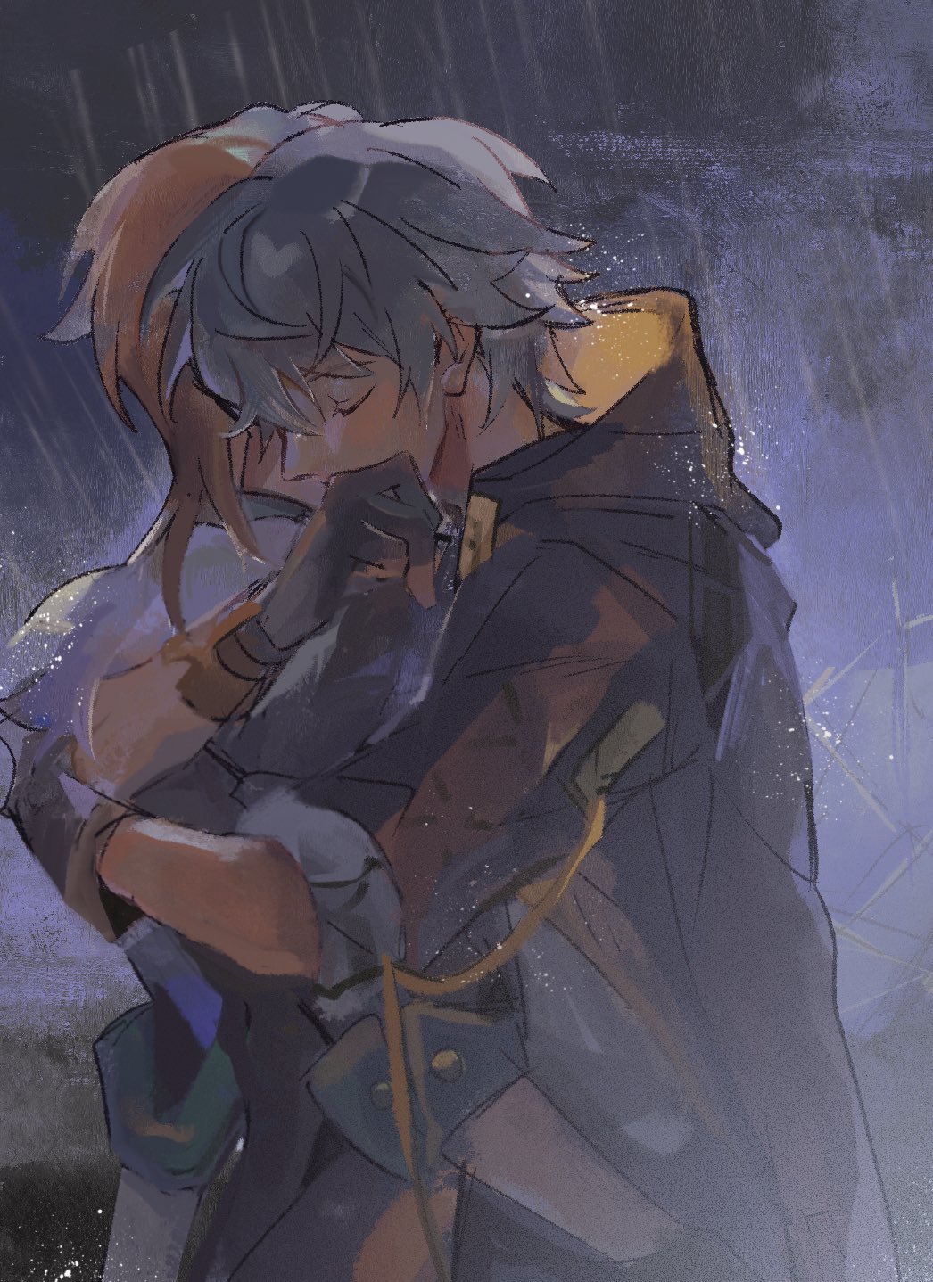 2boys aventurine_(honkai:_star_rail) back black_coat black_gloves black_jacket blonde_hair blue_sky caelus_(honkai:_star_rail) closed_eyes cloud cloudy_sky coat covered_mouth cowboy_shot fingerless_gloves fur-trimmed_jacket fur_trim gloves grey_hair hair_between_eyes highres honkai:_star_rail honkai_(series) hood hooded_coat hug jacket long_sleeves male_focus multiple_boys orange_coat outdoors rain short_hair sky standing trailblazer_(honkai:_star_rail) two-sided_coat two-sided_fabric yasutsuki_(tsuki19669056)