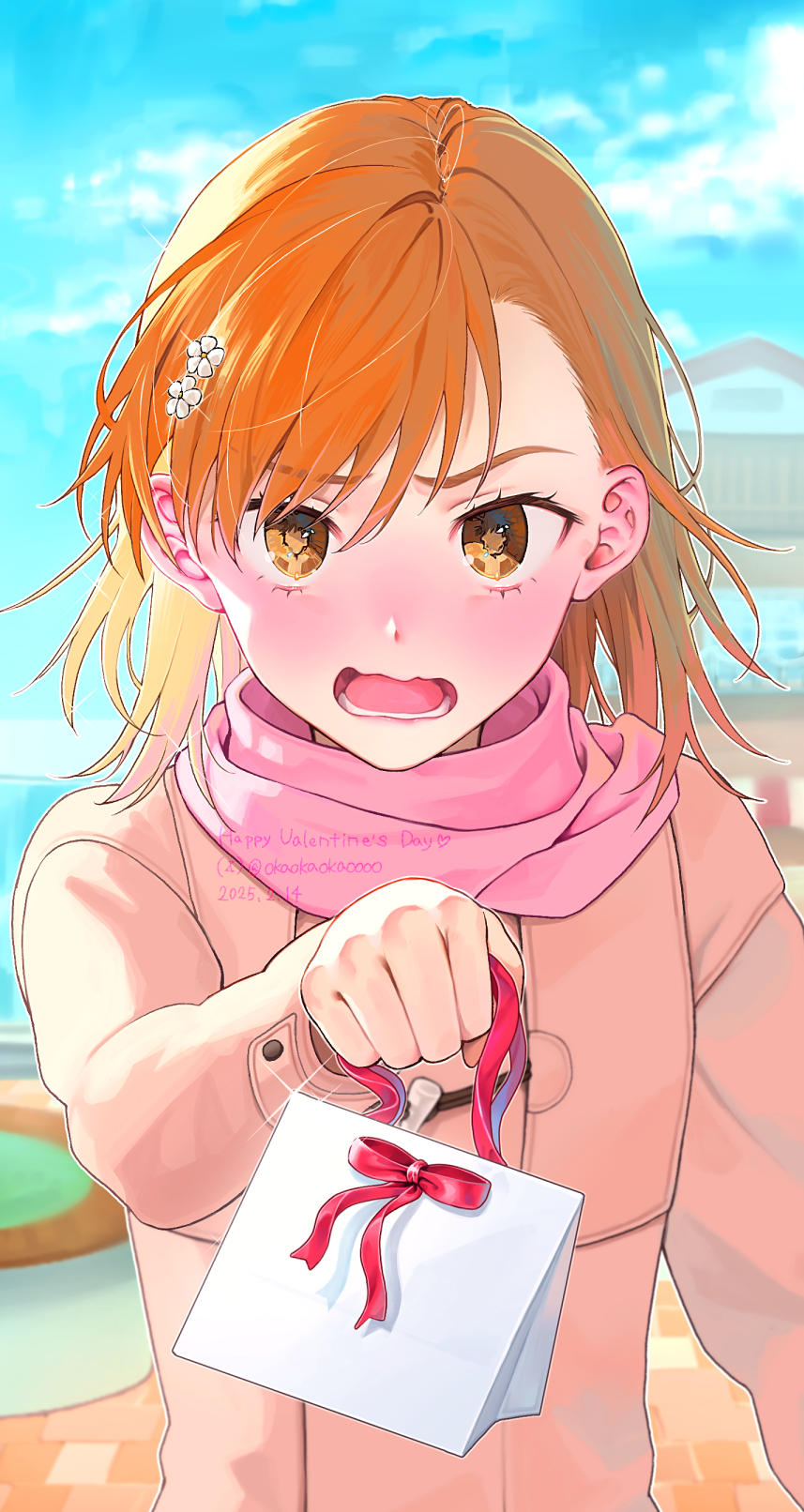1boy 1girl asymmetrical_bangs blush brown_coat brown_eyes brown_hair coat commentary_request eye_reflection gift_bag hair_ornament hairpin happy_valentine highres kamijou_touma medium_hair misaka_mikoto okaokaokaoooo open_mouth outdoors pink_scarf reflection scarf solo_focus toaru_kagaku_no_railgun toaru_majutsu_no_index valentine