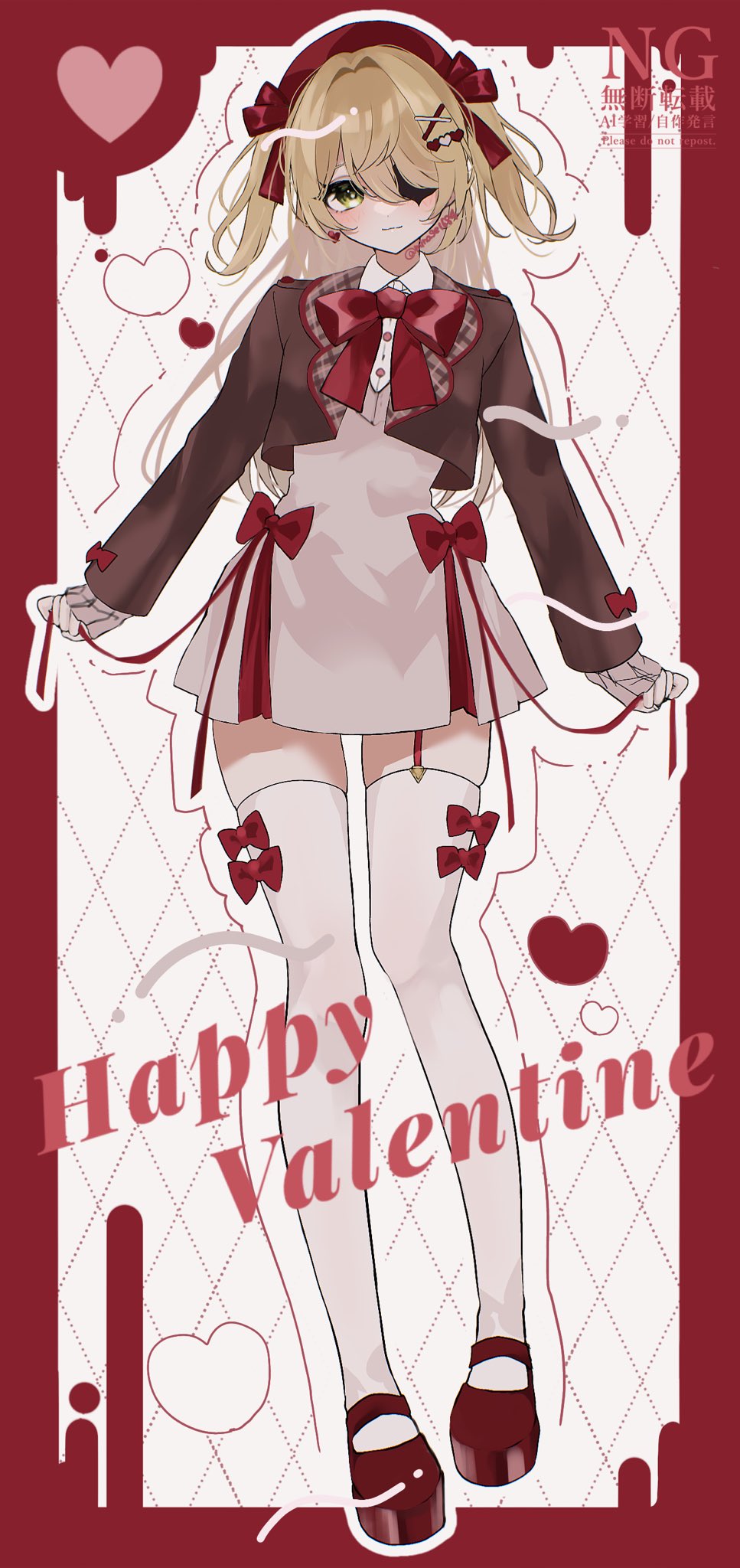 1girl adversarial_noise alternate_costume blonde_hair bow bow_legwear closed_mouth dress english_text eyepatch fischl_(genshin_impact) full_body garter_straps genshin_impact green_eyes happy_valentine highres long_hair long_sleeves looking_at_viewer maguro_(minase1684) red_bow red_shoes shoes single_garter_strap smile solo standing thighhighs two_side_up white_dress white_thighhighs zettai_ryouiki