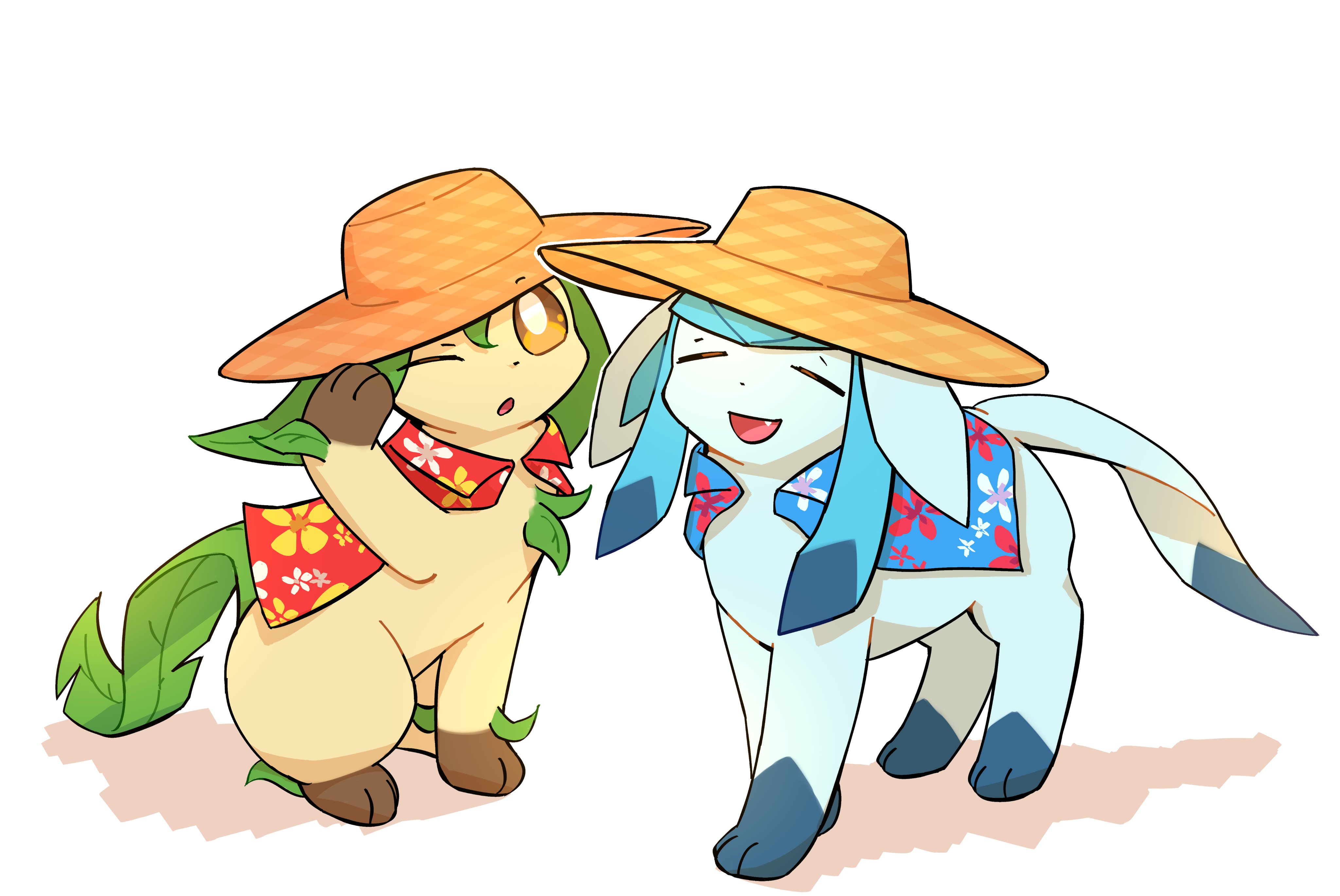 :o ;d absurdres animal_focus animal_hands blue_fur blue_jacket bright_pupils brown_eyes closed_eyes clothed_pokemon fang floral_print full_body gen_4_pokemon glaceon glide_away green_fur hat highres jacket leaf leafeon looking_at_viewer nintendo no_humans one_eye_closed open_mouth pokemon pokemon_(creature) red_jacket sidelocks simple_background sitting smile standing straw_hat tail white_background white_pupils yellow_fur