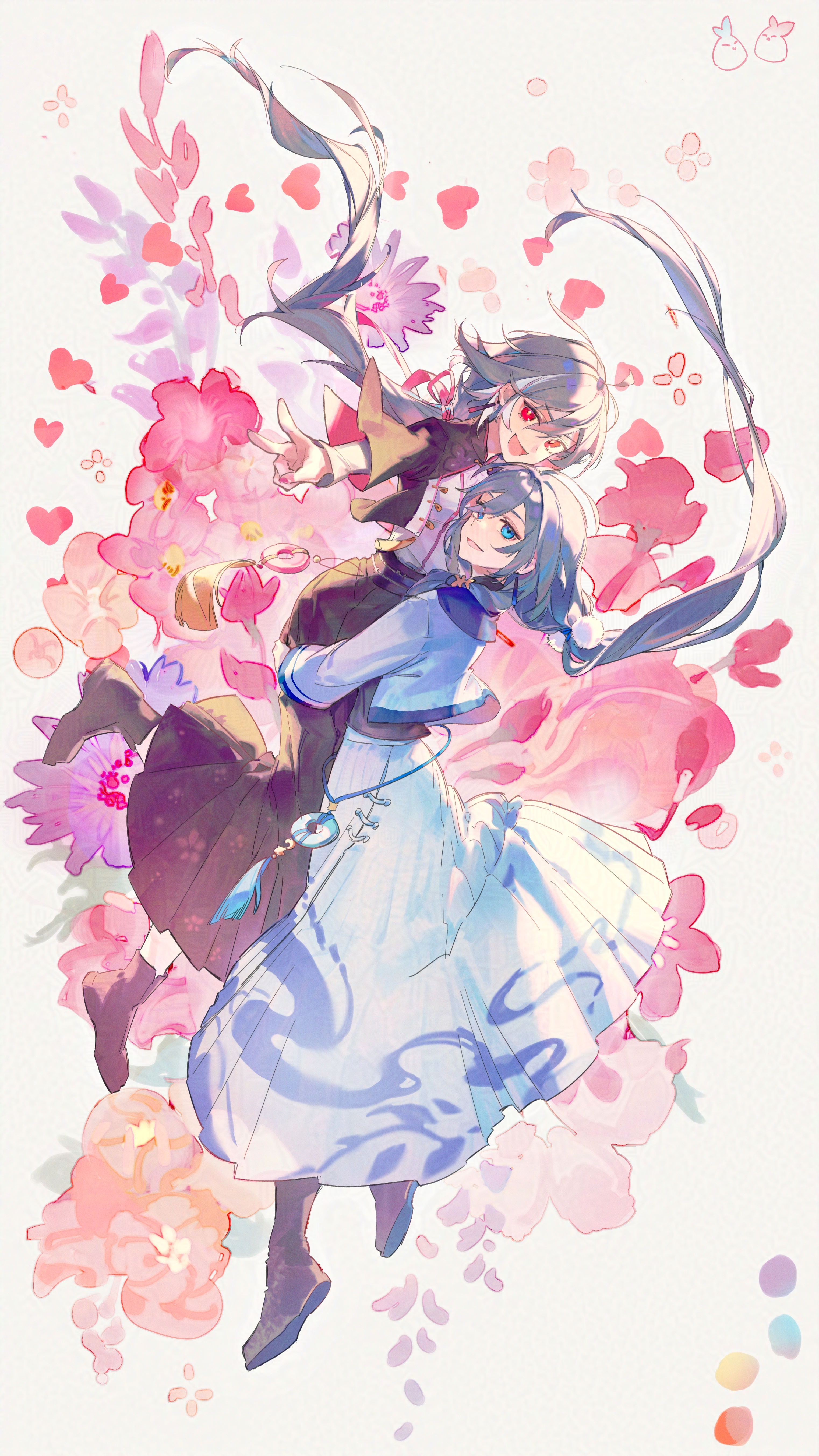2girls absurdres black_jacket black_shoes black_skirt blue_eyes blue_jacket blue_skirt carrying carrying_person chinese_commentary commentary_request floating_hair flower fu_hua herrscher_of_sentience full_body grey_hair hair_ornament heart highres honkai_(series) honkai_impact_3rd jacket long_hair long_skirt long_sleeves looking_at_viewer low-tied_long_hair multiple_girls open_mouth pink_flower pom_pom_(clothes) pom_pom_hair_ornament red_eyes shirt shoes skirt smile v valentine very_long_hair white_background white_shirt xiaoxiaoanye