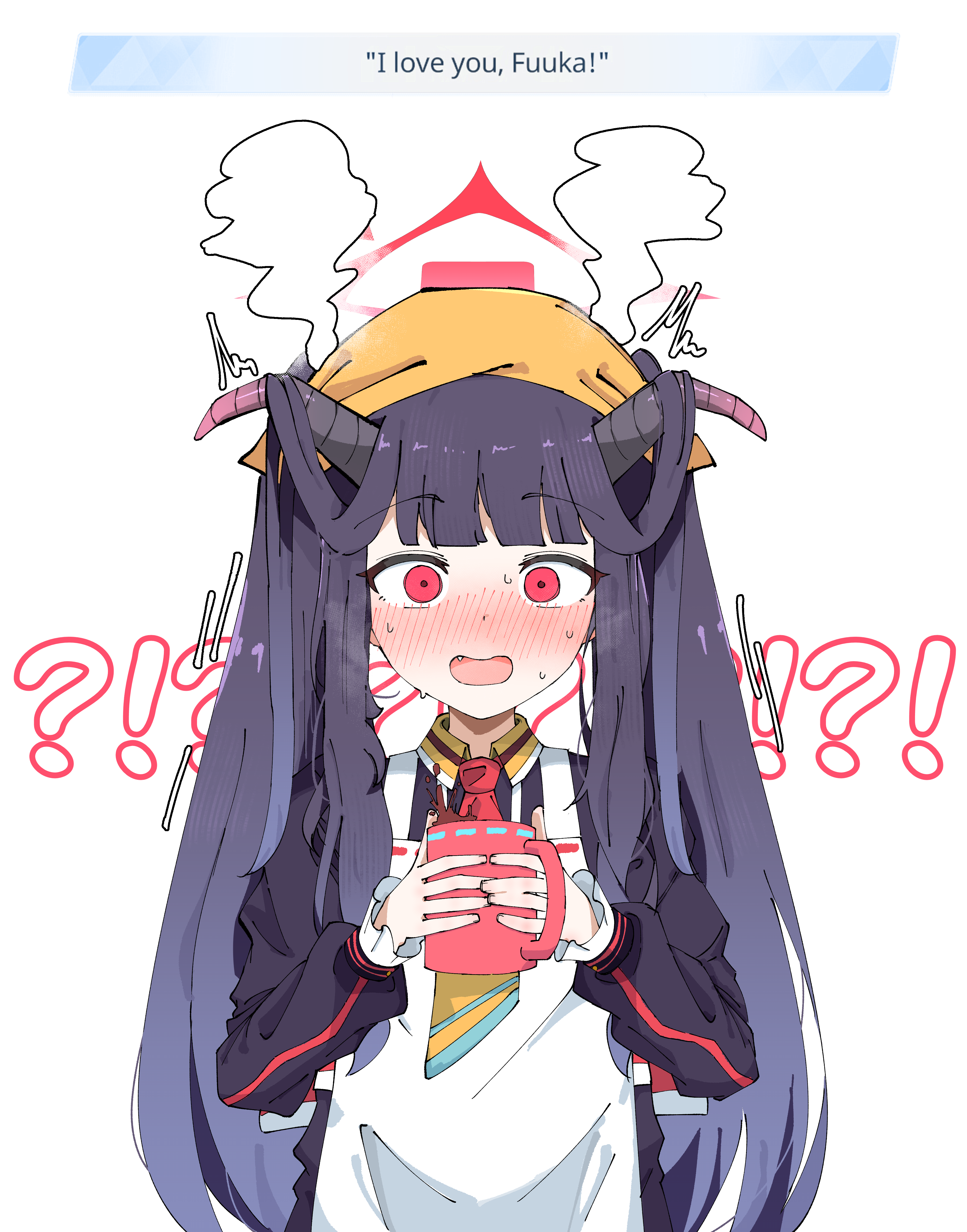 !? 1girl absurdres apron black_jacket blue_archive blush coffee_mug cup demon_girl demon_horns fang fuuka_(blue_archive) hair_between_eyes hairband hamuhamuid highres holding holding_cup horns jacket long_hair looking_at_viewer mug necktie open_mouth purple_hair red_eyes red_necktie sidelocks sweatdrop twintails white_apron yellow_hairband