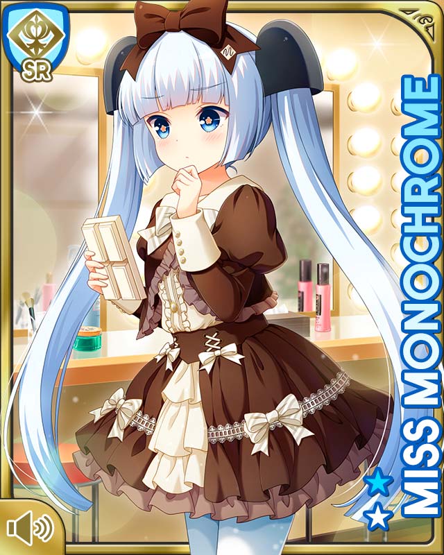 1girl black_footwear blue_eyes blunt_bangs bow brown_bow brown_dress card character_name day dress frilled_dress frills girlfriend_(kari) hand_by_own_face indoors leggings miss_monochrome miss_monochrome_(character) official_art open_mouth qp:flapper solo standing tagme thighhighs thinking twintails white_bow white_hair white_leggings