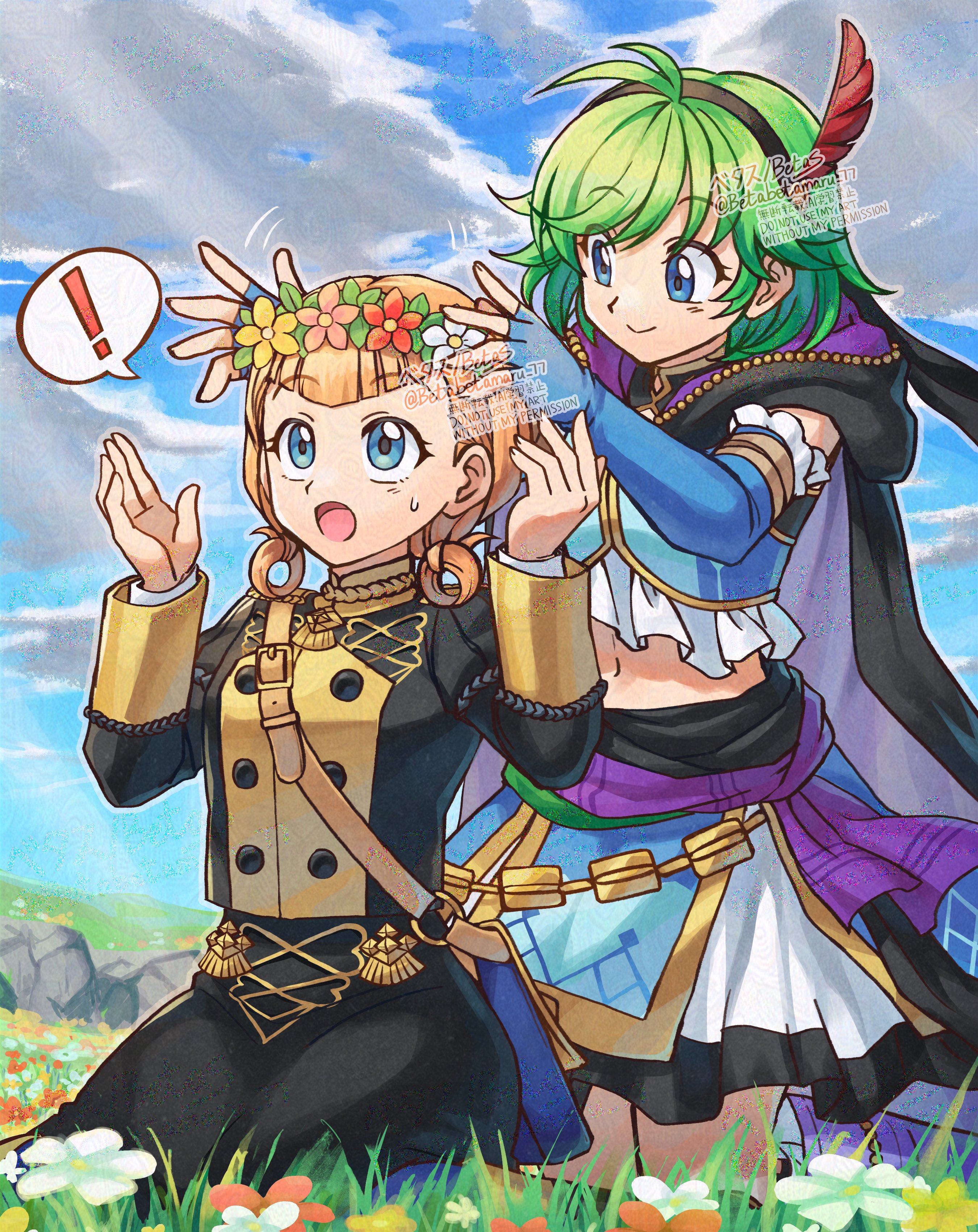 ! 2girls absurdres annette_fantine_dominic betabetamaru black_cloak black_headband black_skirt blue_eyes blue_pantyhose braid braided_hair_rings cloak elbow_gloves epaulettes feather_hair_ornament feathers fingerless_gloves fire_emblem fire_emblem:_the_blazing_blade fire_emblem:_three_houses fire_emblem_heroes frilled_skirt frills garreg_mach_monastery_uniform gloves hair_ornament hair_rings head_wreath headband highres hood hooded_coat kneeling layered_skirt midriff multiple_girls navel nino_(fang's_heart)_(fire_emblem) nino_(fire_emblem) nintendo official_alternate_costume open_mouth orange_hair pantyhose sitting skirt wariza