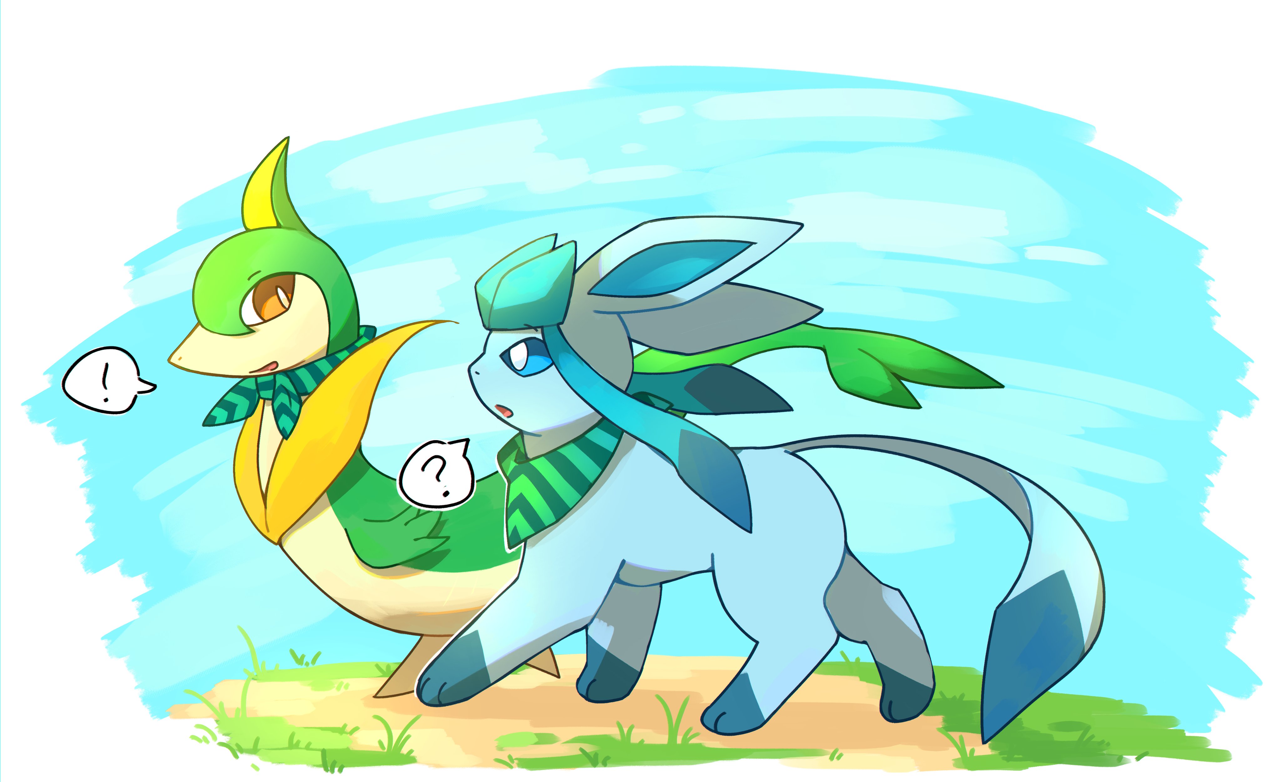! :o ? absurdres animal_focus animal_hands blue_eyes blue_fur blue_sky brown_eyes full_body gen_4_pokemon gen_5_pokemon glaceon glide_away green_scarf highres looking_at_another nintendo no_humans outdoors pokemon pokemon_(creature) scarf servine sidelocks sky snake standing striped_clothes striped_scarf tail walking white_background