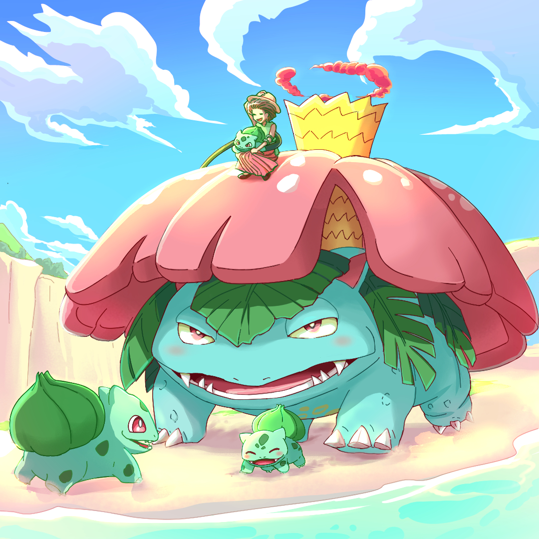 1girl blue_sky bright_pupils brown_hair bulbasaur cloud dynamax fangs fyuusan-1986 gen_1_pokemon gigantamax gigantamax_venusaur green_shirt long_skirt nintendo nostrils open_mouth outdoors pink_skirt pokemon pokemon_(creature) red_eyes riding riding_pokemon shirt shore skirt sky venusaur white_pupils