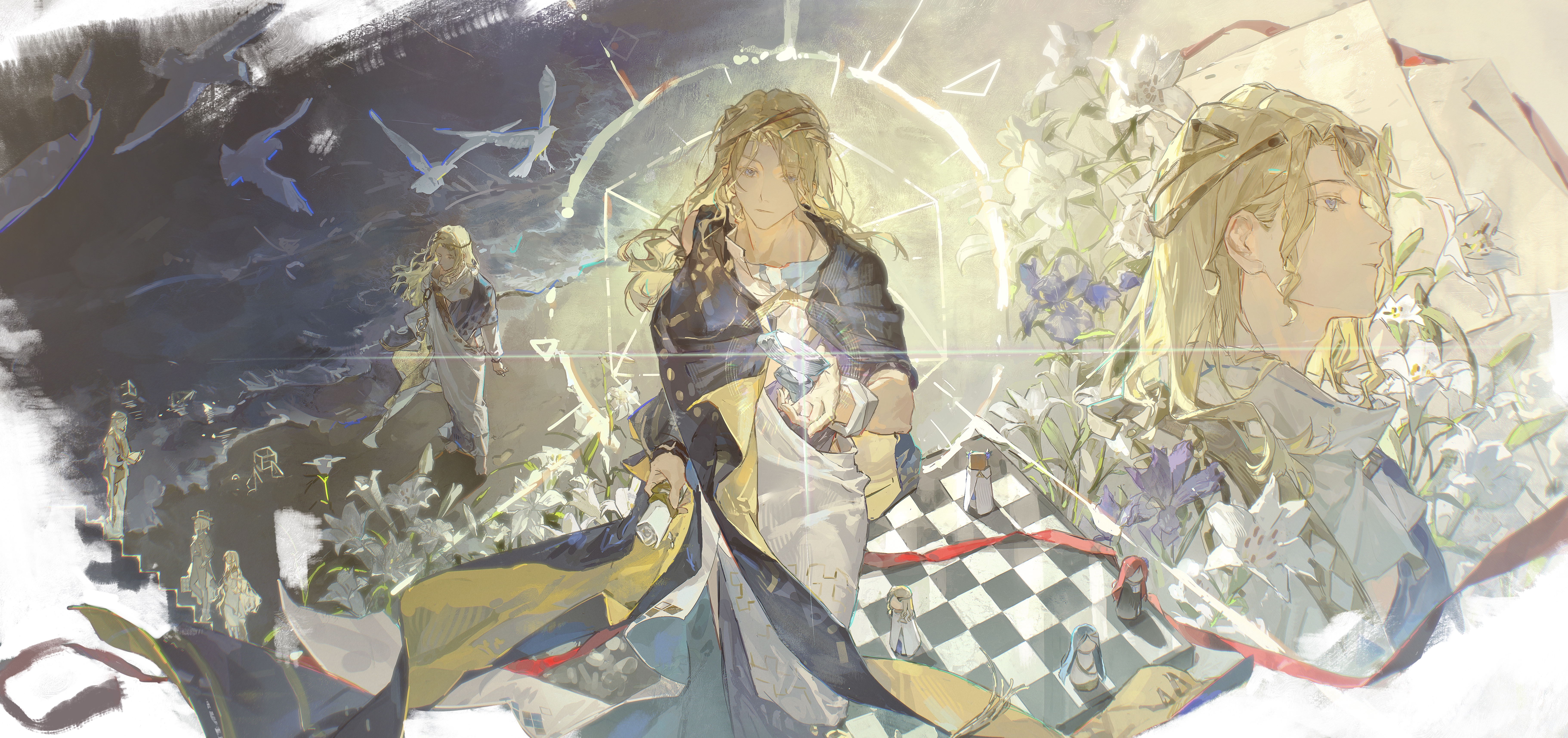 210_(reverse:1999) 2boys 37_(reverse:1999) 4girls 6_(reverse:1999) absurdres ancient_greek_clothes beach bird black_cloak black_pants black_shirt blonde_hair blue_cape blue_eyes blue_hair board_game boater_hat bracelet cape chess chessboard circlet cloak cube floating floating_hair floating_object flower from_above from_side glint glowing greco-roman_clothes highres himation holding holding_scroll jewelry looking_at_another looking_at_viewer looking_up male_focus multiple_boys multiple_girls multiple_views ocean outstretched_hand pants paper parted_bangs purple_flower red_hair red_ribbon reverse:1999 ribbon robe sand scroll shirt sidelocks sophia_(reverse:1999) vertin_(reverse:1999) waves white_bird white_cloak white_flower white_robe yellow_cape you'er