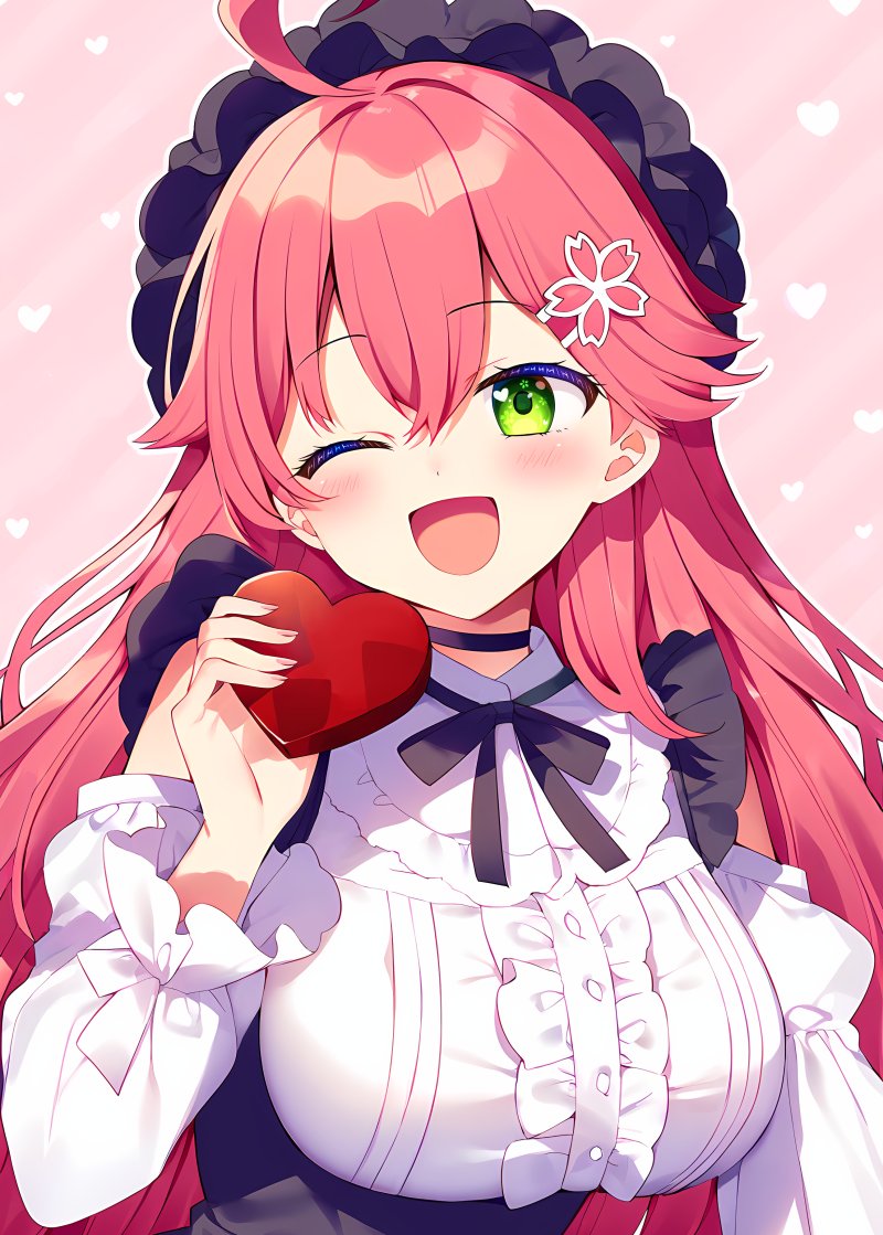 &{ID:11461718 CreatedAt:Fri Feb 14 22:30:29 -0600 2025 Score:0 Width:800 Height:1119 MD5:2a54866a4c662567c3560e49d2140dc1 Directory:2a/54 Image:2a54866a4c662567c3560e49d2140dc1.jpg Rating:general Source:https://twitter.com/kuronekoron2/status/1890391193806135557 Change:1739593830 Owner:danbooru CreatorID:6498 ParentID:0 Sample:0 PreviewHeight:350 PreviewWidth:250 Tags:1girl ahoge alternate_costume black_ribbon blush bodice candy chocolate chocolate_heart clothing_cutout commentary_request flower food frilled_shirt frills green_eyes hair_between_eyes hair_flower hair_ornament hairclip heart heart-shaped_food heart_background heart_in_eye holding holding_chocolate holding_food hololive kuronekoron long_hair long_sleeves looking_at_viewer neck_ribbon one_eye_closed pink_background pink_hair ribbon sakura_miko shirt shoulder_cutout smile solo symbol_in_eye valentine virtual_youtuber white_shirt Title: HasNotes:false HasComments:false FileURL:https://img2.gelbooru.com/images/2a/54/2a54866a4c662567c3560e49d2140dc1.jpg PreviewURL:https://gelbooru.com/thumbnails/2a/54/thumbnail_2a54866a4c662567c3560e49d2140dc1.jpg SampleURL: SampleHeight:0 SampleWidth:0 Status:active PostLocked:0 HasChildren:false IsVideo:false DisplayDate:14.02.2025 22:30}