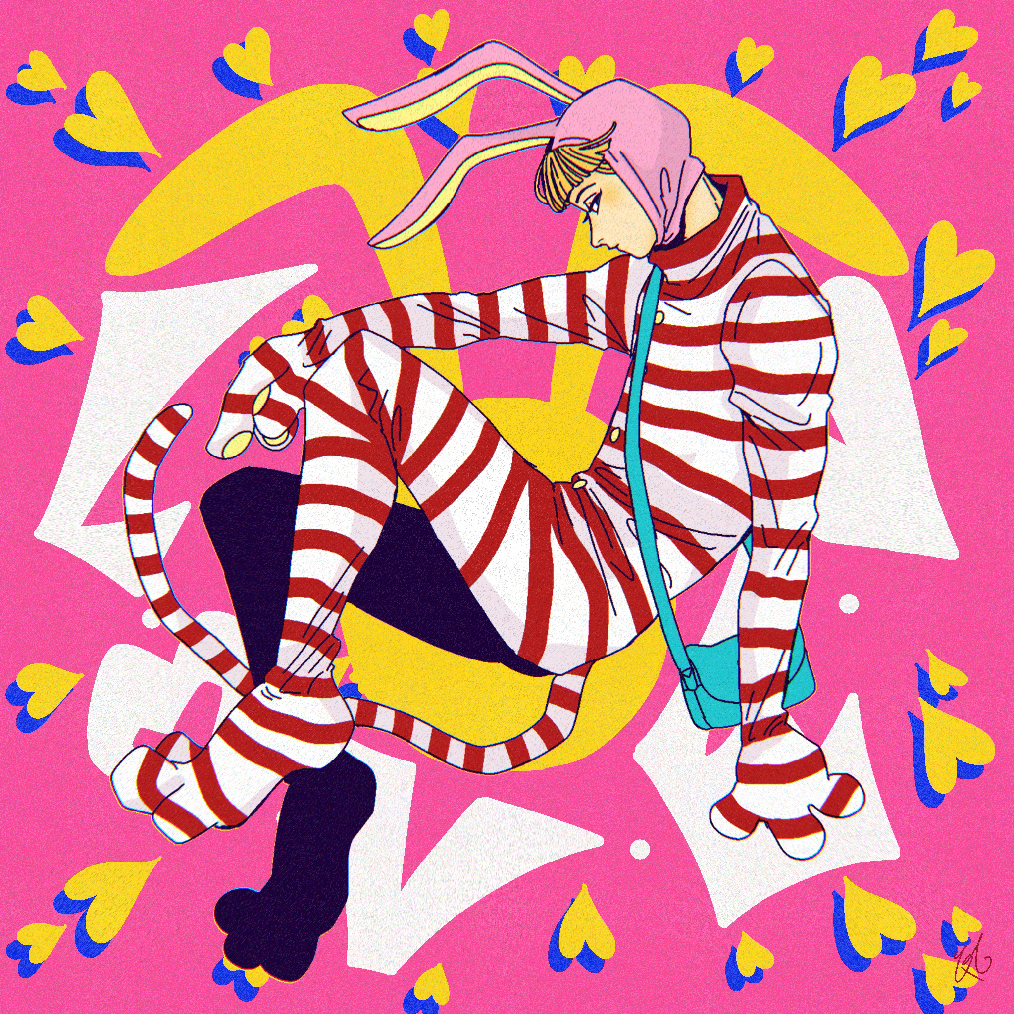 0t0maruchan 1boy animal_hat black_eyes blonde_hair bodysuit full_body hat highres looking_at_viewer male_focus pink_background popee_(popee_the_performer) popee_the_performer rabbit_hat short_hair solo striped_bodysuit tail very_short_hair