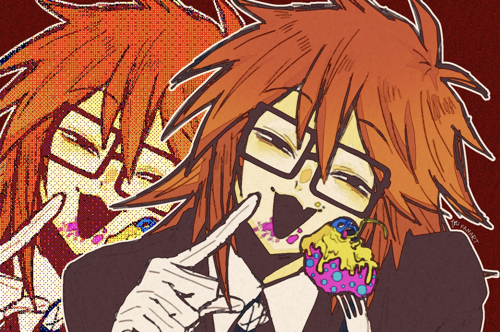 0t0maruchan 1boy :3 commentary_request fang food food_on_face fork gloves hand_up head_tilt highres holding holding_fork index_finger_raised looking_at_viewer male_focus orange_hair randal's_friends randal_ivory red_background simple_background skin_fang upper_body