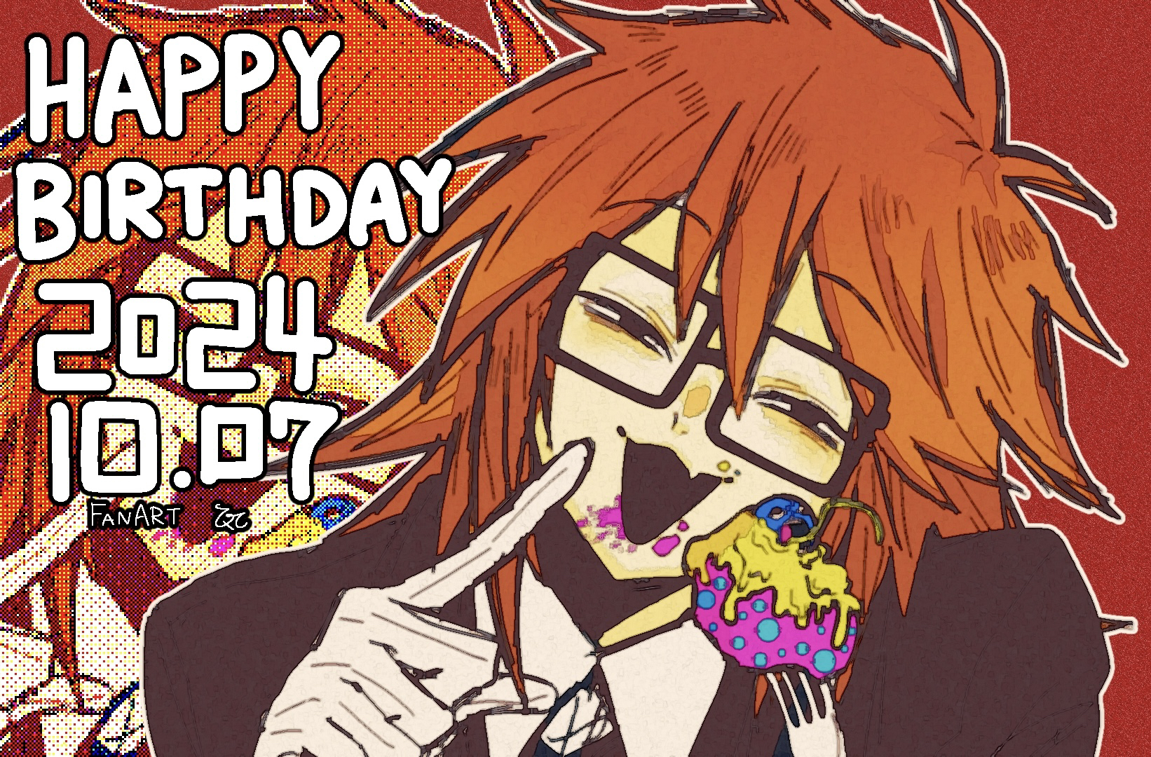 0t0maruchan 1boy :3 commentary_request dated fang food food_on_face fork gloves hand_up happy_birthday head_tilt highres holding holding_fork index_finger_raised looking_at_viewer male_focus orange_hair randal's_friends randal_ivory red_background simple_background skin_fang upper_body