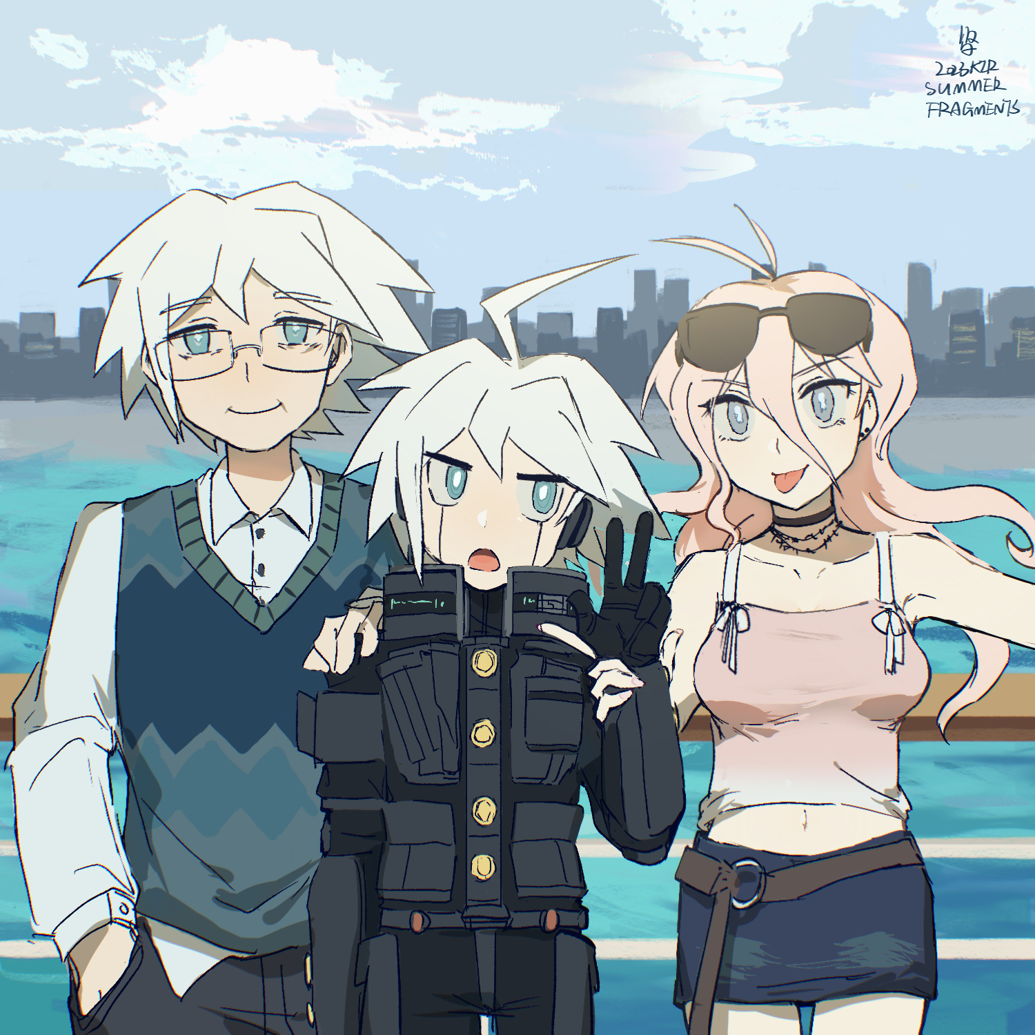 1girl 2boys ahoge android antenna_hair armor blonde_hair blue_eyes breasts cityscape commentary_request danganronpa_(series) danganronpa_v3:_killing_harmony father_and_child father_and_son gloves grey_hair hair_between_eyes hand_on_another's_shoulder highres holding_another's_wrist iruma_miu k1-b0 long_hair mature_male multiple_boys navel open_mouth outdoors pants parent_and_child pink_shirt pink_tank_top power_armor professor_iidabashi shirt short_hair skirt sky smile sweater_vest tank_top tongue tongue_out upper_body v water white_hair xian_(axxxx-721)