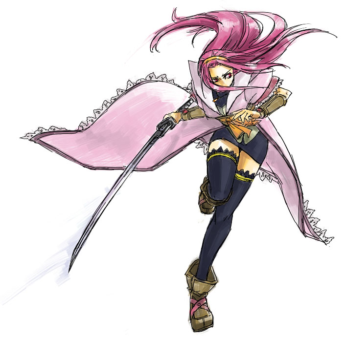1girl akagishi_k armor ascot black_shirt black_skirt black_thighhighs boots bracer breastplate brown_boots coat collared_coat commentary_request covered_mouth fighting_stance fingernails floating_clothes floating_hair frilled_sleeves frills full_body furrowed_brow hairband holding holding_sword holding_weapon hoshi_wo_miru_hito lace lace-trimmed_coat lace-trimmed_thighhighs lace_trim leg_up long_hair looking_to_the_side miniskirt misa_(hoshi_wo_miru_hito) partial_commentary pink_coat pink_hair puffy_short_sleeves puffy_sleeves red_eyes sailor_collar shirt short_sleeves sidelocks simple_background skirt solo stargazer_(series) sword thighhighs very_long_hair weapon white_background white_sailor_collar yellow_ascot yellow_hairband