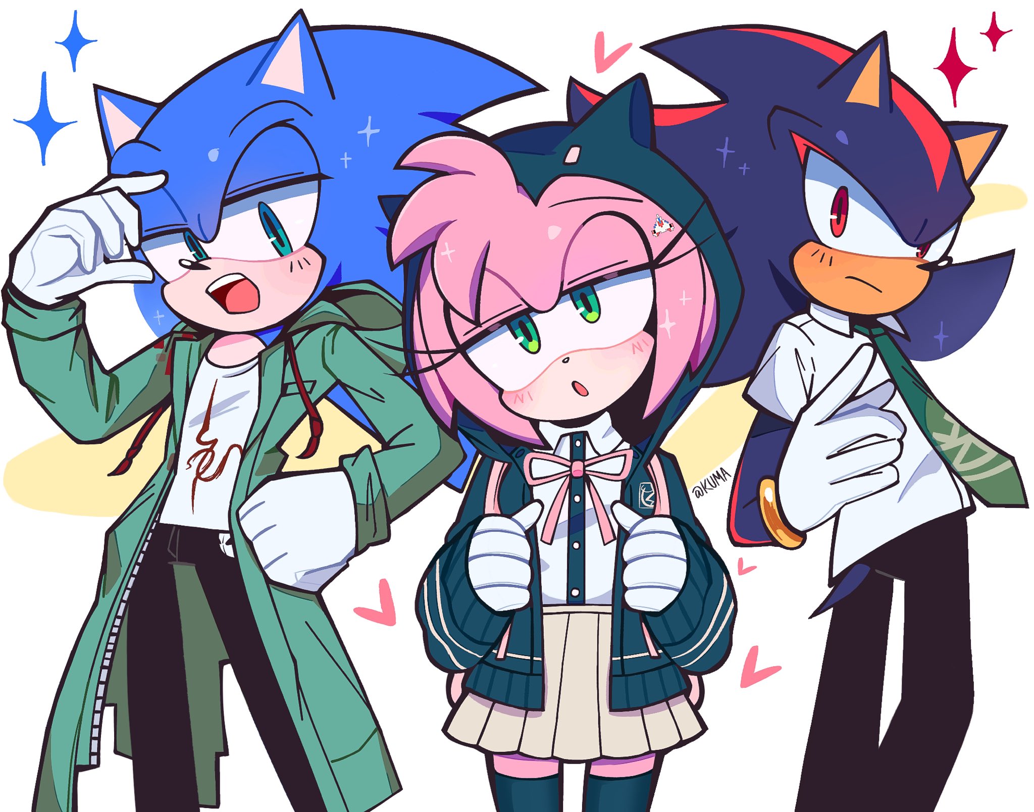 1girl 2boys amy_rose black_hair black_jacket black_pants black_shirt black_thighhighs blue_hair closed_mouth collared_shirt colored_skin cosplay d: danganronpa_(series) danganronpa_2:_goodbye_despair dress_shirt green_eyes green_jacket green_necktie heart highres hinata_hajime hinata_hajime_(cosplay) hood hooded_jacket jacket komaeda_nagito komaeda_nagito_(cosplay) kumakumaoii long_sleeves multiple_boys nanami_chiaki nanami_chiaki_(cosplay) neck_ribbon necktie open_clothes open_jacket open_mouth pants pink_hair pink_ribbon pink_skin print_shirt red_eyes red_hair ribbon shadow_the_hedgehog shirt shirt_tucked_in short_hair sonic_(series) sonic_the_hedgehog sparkle teeth thighhighs upper_teeth_only white_shirt