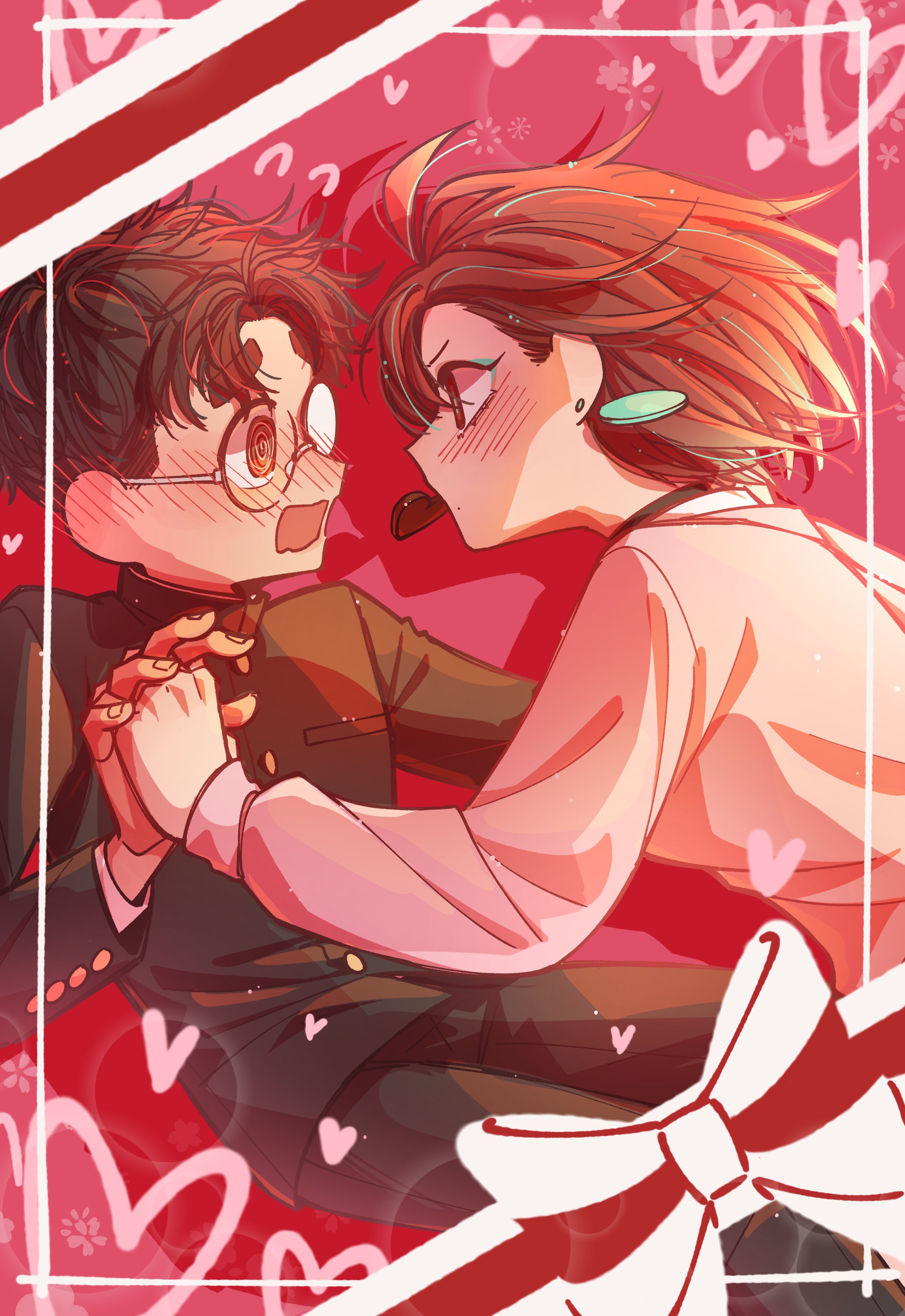 1boy 1girl @_@ absurdres ayase_momo black_choker black_jacket black_pants blush brown_eyes brown_hair candy chocolate chocolate_heart choker commentary couple crescentbutton dandadan ear_blush earrings embarrassed english_commentary flying_sweatdrops food food_in_mouth from_side gakuran glasses heart heart-shaped_food highres holding_hands interlocked_fingers jacket jewelry leaning_back leaning_forward long_sleeves looking_at_another messy_hair mouth_hold open_mouth pants pink_sweater profile ribbon round_eyewear school_uniform short_hair sweater takakura_ken_(dandadan) upper_body valentine