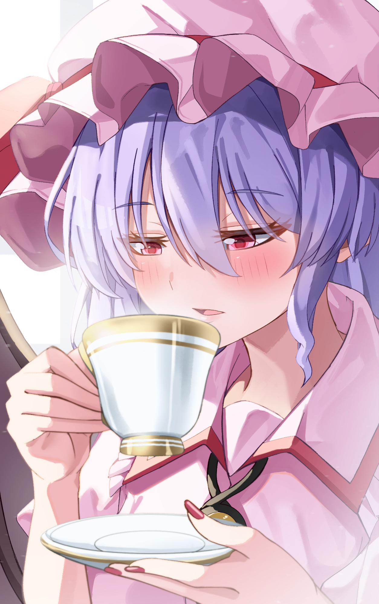 1girl bat_wings blue_hair blush bow brooch collared_shirt commentary_request cup eyelashes hair_between_eyes half-closed_eyes hat hat_bow highres holding holding_cup holding_plate jewelry mahoro_(minase_mahoro) mob_cap nail_polish parted_lips pink_hat pink_shirt plate puffy_short_sleeves puffy_sleeves red_bow red_eyes red_nails remilia_scarlet shirt short_hair short_sleeves solo teacup touhou upper_body wings