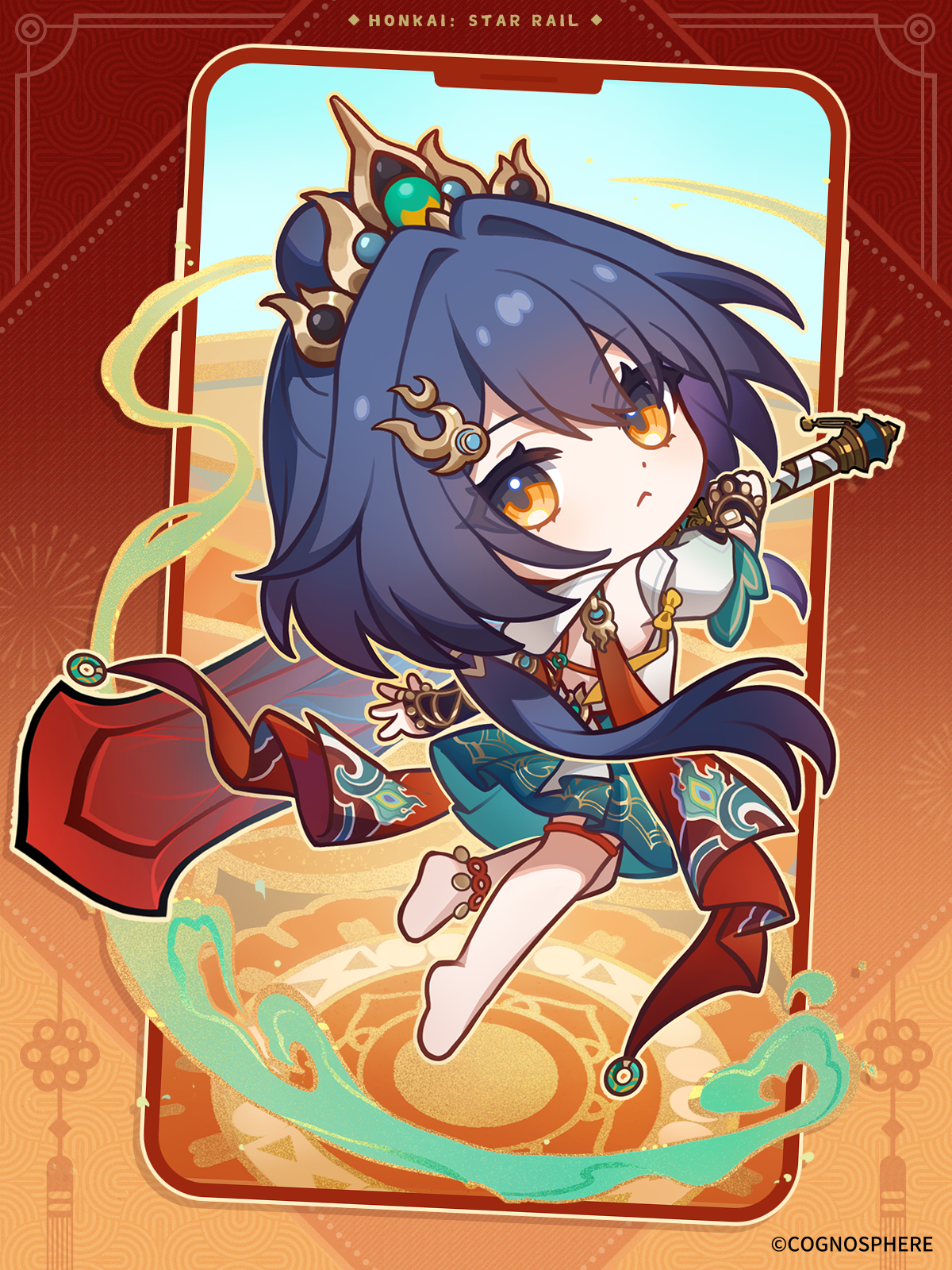 1girl aqua_skirt back back_cutout barefoot black_gloves blue_hair blue_sky chibi chinese_clothes closed_mouth clothing_cutout commentary copyright_name day english_commentary fingerless_gloves from_behind full_body gloves gold_ring hair_ornament headpiece highres holding holding_sword holding_weapon honkai:_star_rail honkai_(series) long_hair looking_back low_twintails official_art orange_eyes shirt short_sleeves skirt sky solo sword twintails weapon white_shirt yunli_(honkai:_star_rail)