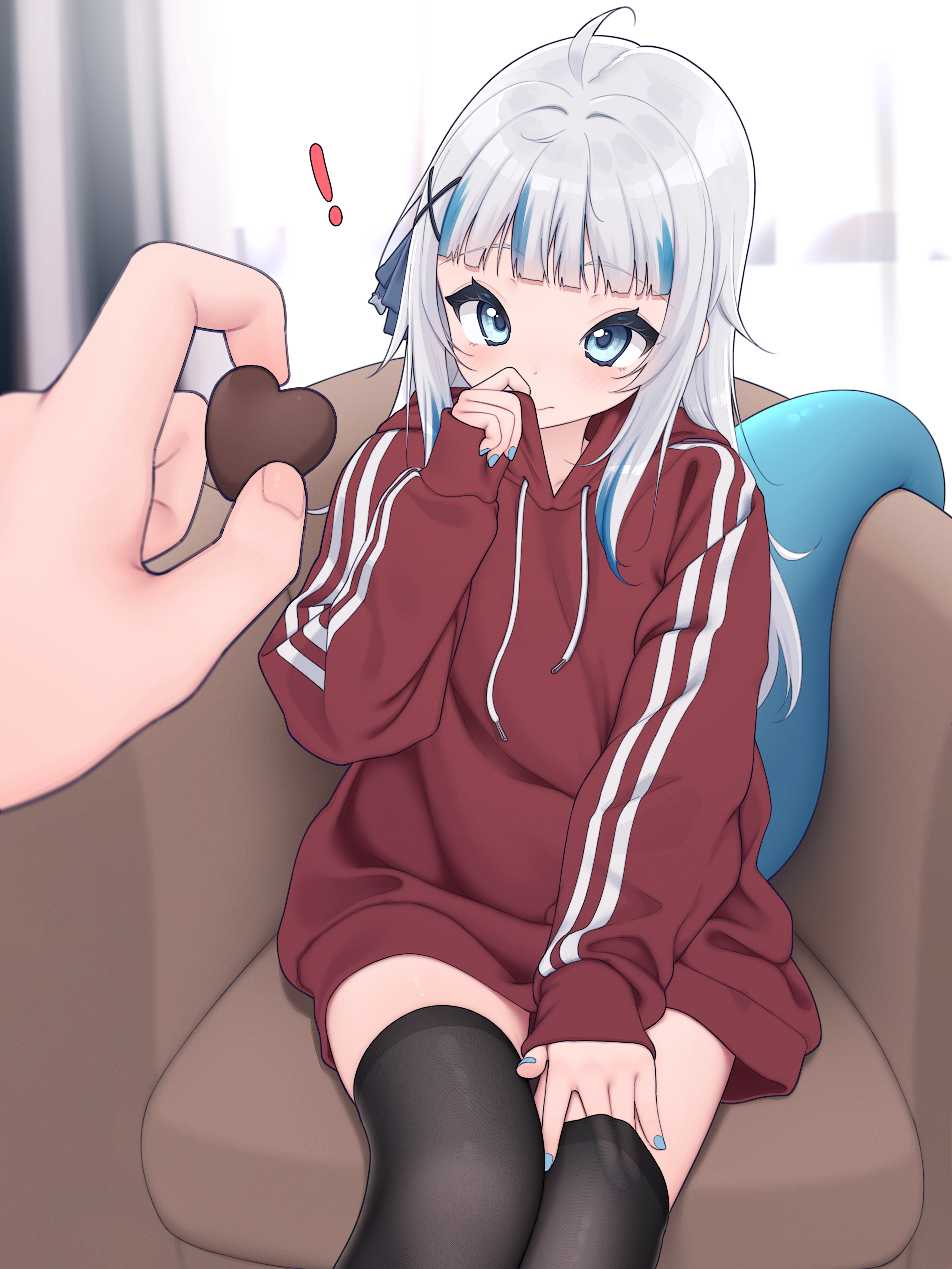! 1girl 1other absurdres ahoge black_thighhighs blue_eyes blue_hair blue_nails candy chocolate chocolate_heart fins fish_tail food gawr_gura grey_hair hair_ornament heart heart-shaped_food highres holding holding_chocolate holding_food hololive hololive_english hood hoodie indoors long_hair looking_at_viewer lucasyecla99 multicolored_hair red_hoodie shark_girl shark_tail sitting solo_focus tail thighhighs virtual_youtuber x_hair_ornament