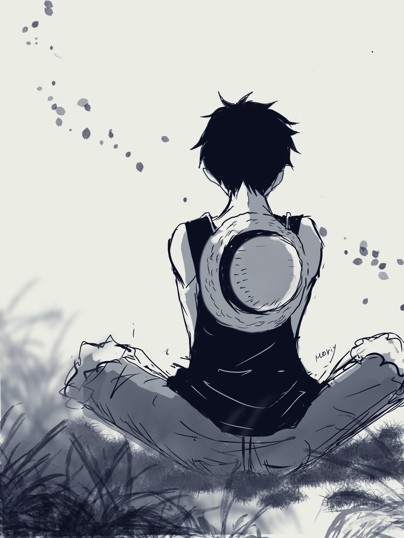 1boy back bad_id bad_twitter_id grass greyscale hat highres indian_style male_focus monkey_d._luffy monochrome moriy0722 on_ground one_piece short_hair shorts signature sitting sleeveless solo straw_hat