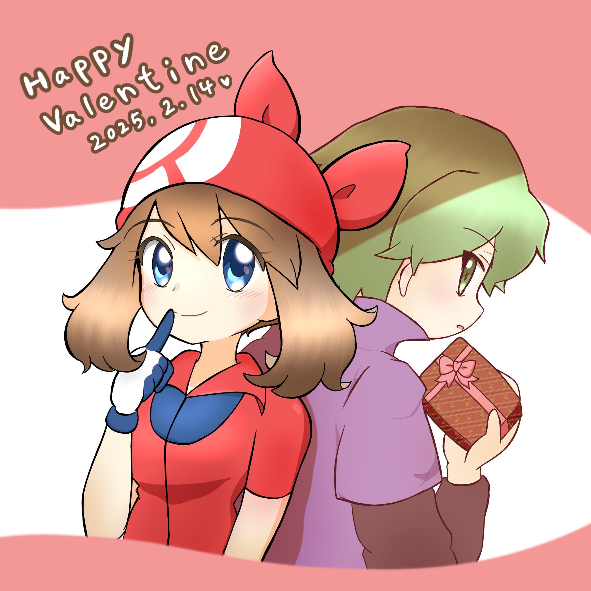 1boy 1girl back-to-back bandana black_shirt blue_eyes blush brown_hair dated drew_(pokemon) finger_to_mouth gloves green_eyes green_hair hair_between_eyes happy_valentine highres index_finger_raised jacket long_sleeves looking_at_viewer looking_back may_(pokemon) nintendo pokemon pokemon_(anime) pokemon_the_series:_ruby_and_sapphire purple_jacket red_bandana red_shirt shirt short_hair short_sleeves smile upper_body xrqu2xk8qb47501